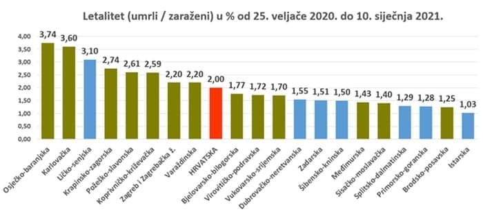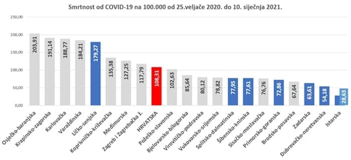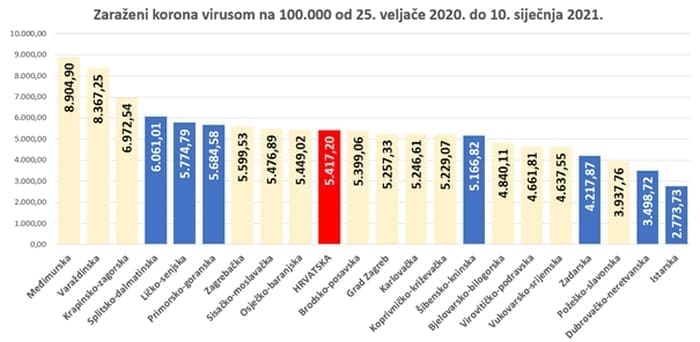 Najveće stope zaraženih koronom od početka pandemije do 10. siječnja ispoljile su se u sjevernim hrvatskim županijama: Međimurska, Varaždinska i Krapinsko-zagorska. Iza njih slijede tri jadranske županije: Splitsko-dalmatinska, Ličko-senjska i Primorsko-goranska.