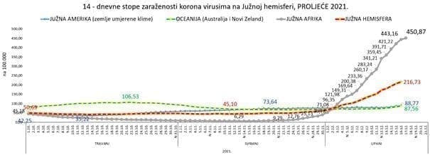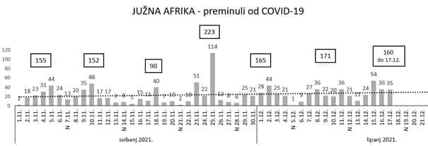 Krivulja 14-dnevnih stopa zaraženosti koronama za Južnu Afriku za posljednja dva dana pokazuje položeniji tijek za razliku od prethodnog gotovo uzlaznog okomitog pravca.