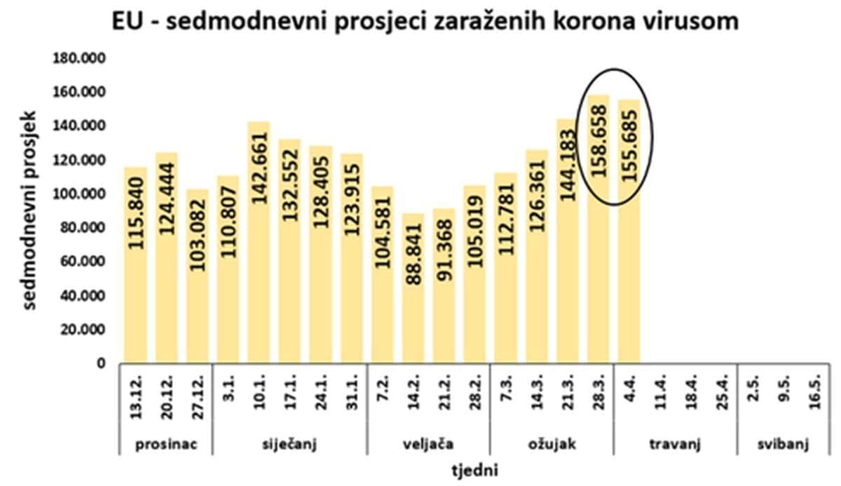 Završavajući obradu podataka za protekli 13. tjedan zamijetio sam da je zbirno u svih 27 zemalja Europske unije (EU) nakon šest tjedana stalnog povećavanja broja zaraženih korona virusom od 14. veljače uslijedio 58. pandemijski tjedan od 29. ožujka do 4. travnja kada je broj prosječno dnevno zaraženih osoba 155.685 bio prvi put manji od sedmodnevnog prosjeka prethodnog tjedna 158.658 osoba. Taj broj manji za svega 2.973 novozaraženih ili 1,87% nije toliko značajan koliko je značajan prekid povećanja broja zaraženih kakav je bio u jesenskom razdoblju u mjesecima od listopada do prosinca 2020. godine. Ovo se može smatrati najavom početka značajnijeg smanjenja novozaraženih (Slika 1.).