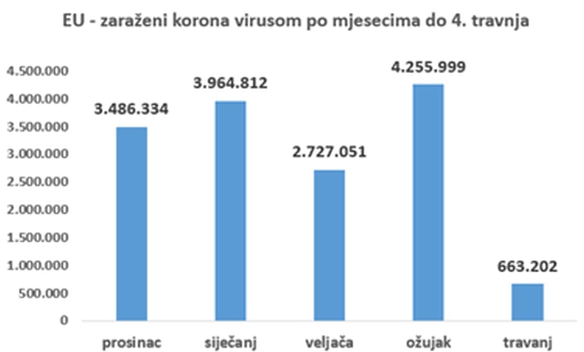 Stubičasti dijagram na slici 5. ilustrira koliko je suprotno očekivanjima broj zaraženih korona virusom u zemljama EU u mjesecu ožujak nadmašio sve prethodne mjesece.