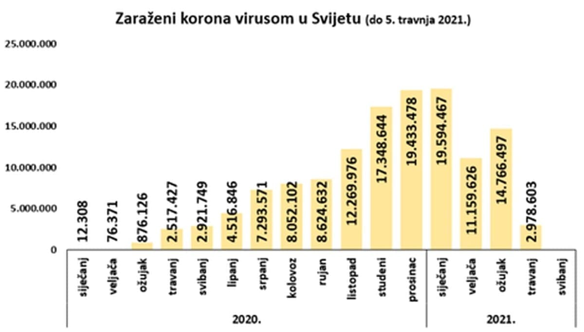 Neočekivano veliko povećanje broja zaraženih dogodilo se u čitavom svijetu te se svugdje počelo govoriti o trećem valu pandemije. Kao uzrok povećanja, osobito u mjesecu ožujku koji je nadmašio veljaču, navodi se pojava brzoširećih mutanata virusa korone. Brojni su to obrazlagali kako koronavirus epidemije nemaju obilježje sezonalnosti, tj. da ekološke klimatske okolnosti nisu bitne za širenje virusa. Tima ističem, ne gledajte pojedinačne primjere pojavnosti, gledajte u ukupnosti. Neka im za primjer posluži činjenica da je od ukupno 132 milijuna zabilježenih zaraženih korona virusom u ovoj pandemiji u cijelom Svijetu do prekjučer 5. travnja 2021. njih 95 milijuna (72%) bilo zaraženo u hladnijem razdoblju godine (listopad-ožujak) (Slika 2.).