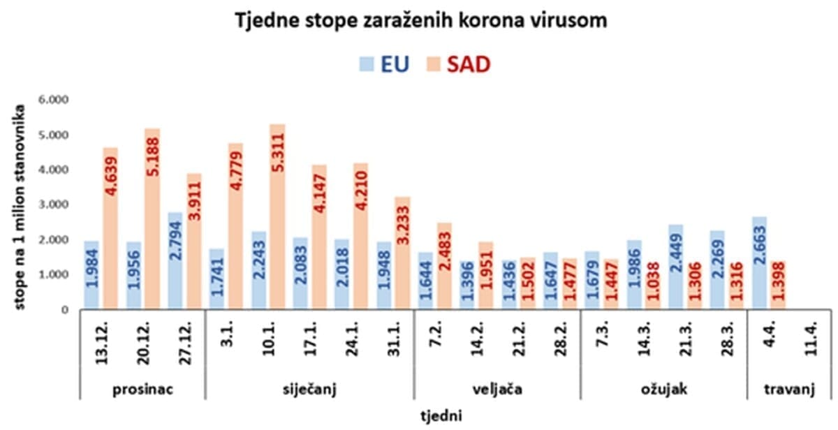 Usporedba tjednih stopa zaraženosti u EU sa SAD gdje se smanjenje stopa zaraženih korona virusom od posljednjeg tjedna mjeseca siječnja nastavilo sve do kraja mjeseca ožujka kada je uslijedilo lagano povećanje kroz posljednja dva tjedna.