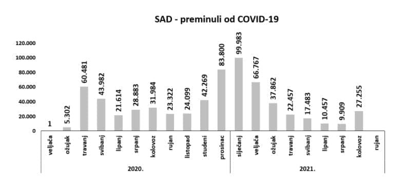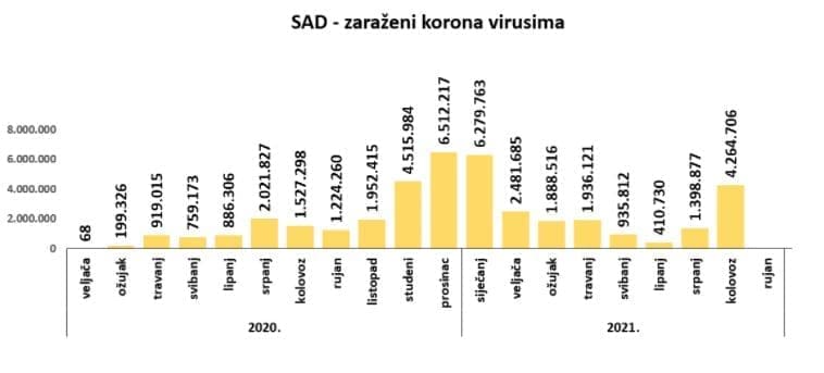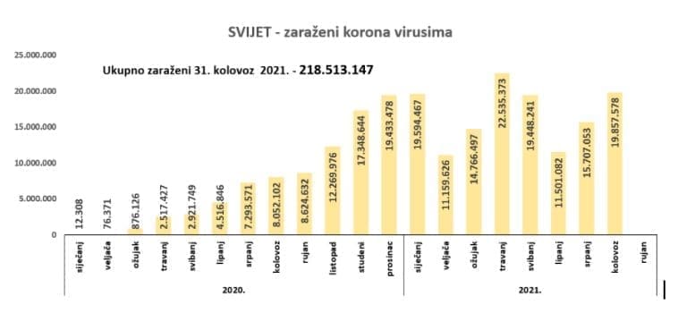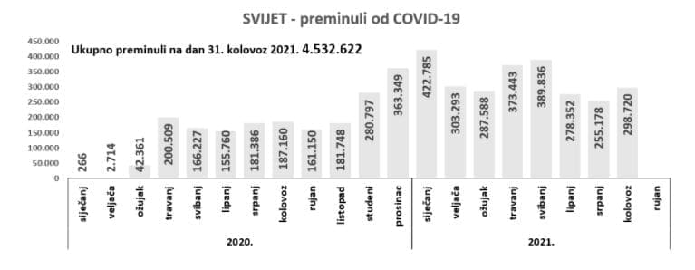 Na grafikonima prikaza broja zaraženih i preminulih po mjesecima u čitavom Svijetu razvidno je da se od siječnja 2021. godine broj zaraženih ne smanjuje zamjetno, dok broj smrtnih ishoda ima izraženiji trend samnjivanja. Tome su uzrok nedostatne količine cjepiva te su prioriteno cijepljene ugrožene skupine najstarijih i bolesnih pa zatim postupno mlađe dobne skupine.