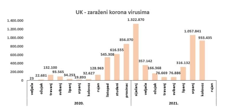 Nakon naprasno prekinute do tada veoma uspješne ljetne turističke sezone polovicom kolovoza broj zaraženih blago raste u mjesecu rujnu da bi veći porast uslijedio u listopadu, a eskalacija povećanja zaraženih slijedi u mjesecima studeni i prosinac. Povećanje broja zaraženih u proljetnom valu od ožujka do svibnja bilo je gotovo na polovici vrijednosti jesensko-zimskog vala. Broj zaraženih u početku ljeta kroz lipanj i srpanj 2021. bio je značajno veći nego 2020. godine. U mjesecu kolovozu uslijedilo je značajno, gotovo trostruko povećanje broja zaraženih.