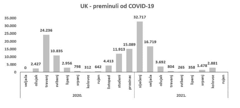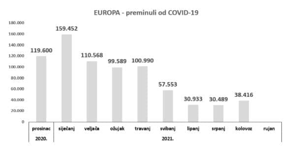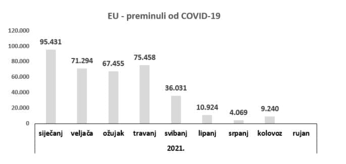 Broj preminulih u siječnju u EU bio je više od 95 tisuća. Unatoč povećanju broja zaraženih u proljetnim mjesecima zahvaljujući cijepljenju postupno se smanjuje broj preminulih do 4 tisuće u srpnju. U kolovozu broj preminulih povećava se više nego dvostruko na 9.240.