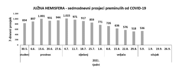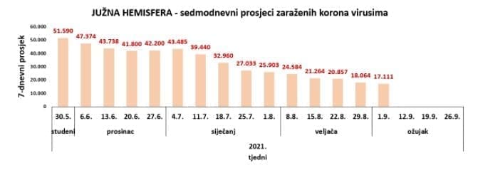 Iz sedmdnevnih prosjeka zaraženih i preminulih od kraja njihovog mjeseca studenog do početka ožujka vidljiv je stalni trend smanjivanja broja zaraženih kroz više od tri mjeseca. Oni su tijekom svoje jeseni imali povećano zaražavanje da bi sada kroz gotovo cijelu kalendarsku zimu imali manji broj zaraženih. Ipak moraju biti na oprezu jer da im se ne dogodi kao nama na sjeveru da nas u travnju „zima ošini repom“.