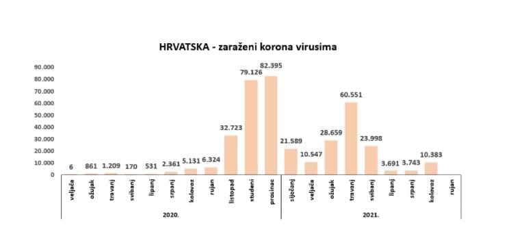 Ukupno kroz svo vrijeme trajanje pandemije u Hrvatskoj do kraja kolovoza 2021. zabilježeno je ukupno 373.998 zaraženih i 8.334 preminulih. Kao u drugim zemljama EU u Hrvatskoj se broj zaraženih po mjesecima kretao u sličnim omjerima. Treba istaknuti mali broj zaraženih na početku pandemije sve do mjeseca srpnja 2020. godine. Zasluge za takvo stanje pripadaju isključivo strogim mjerama zaključavanja gotovo karantenskog oblika.