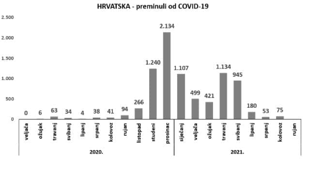 Ugodno iznenađenje bio je niski broj zaraženih i preminulih u razdoblju od siječnja do ožujka kada već unatoč tromjesečne provedbe cijepljenja slijedi neočekivano povećanje preminulih od travnja do lipnja. Preminuli su mahom bili stariji necijepljeni građani diljem Hrvatske. Kroz tri mjeseca umrlo je 2.259 bolesnika od Covid-19 (27,11% svih umrlih u pandemiji). Kroz tri ljetna mjeseca 2021. od lipnja do kolovoza umrlo je 308 oboljelih što je za 225 više umrlih nego u istom ljetnom razdoblju 2020. godine, a obzirom na cijepljenje broj umrlih trebao je biti manji. Objašnjenje razlike: preminuli mahom nisu bili cijepljeni!