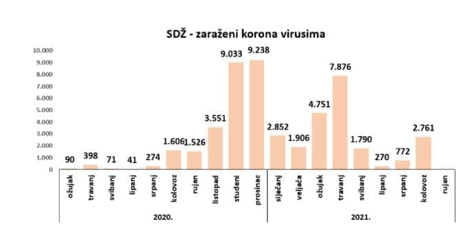 Grafikoni zaraženih i preminulih u SDŽ podudarni su grafikonima Hrvatske kada se promatraju u apsolutnim brojevima te nema potrebe podrobno ih opisivati.