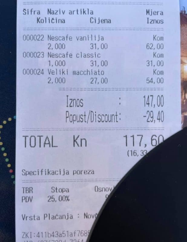 Splitski gradski vijećnik iz redova Centra, Igor Skoko, bio je u Dubrovniku te je danas objavio račun na kojem se vidi cijena tri naručena pića, koja je platio 117.60 kuna.