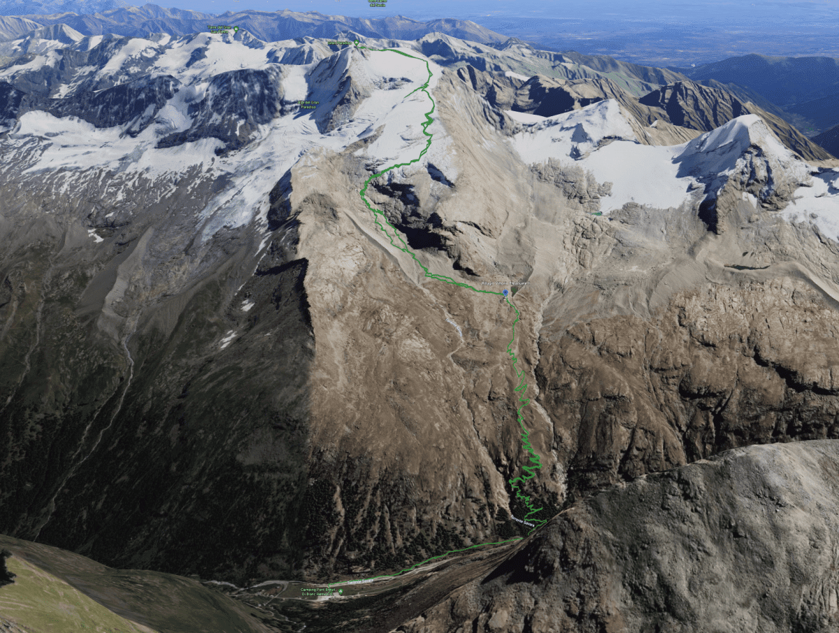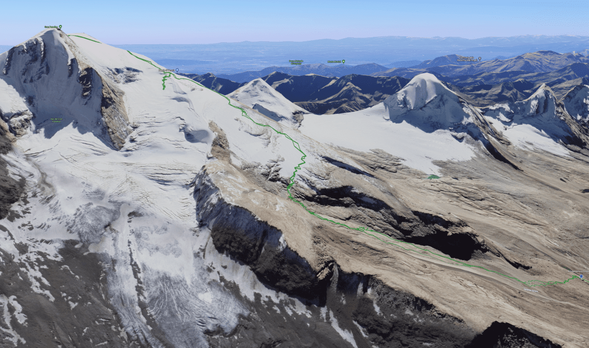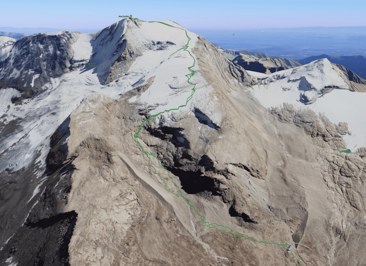 Nakon više od 5 sati hodanja stiže se do vrha ledenjaka odakle slijedi penjanje po kamenim blokovima do vršnog grebena. Na mjestima su postavljeni spitovi koji se koriste za osiguranje.