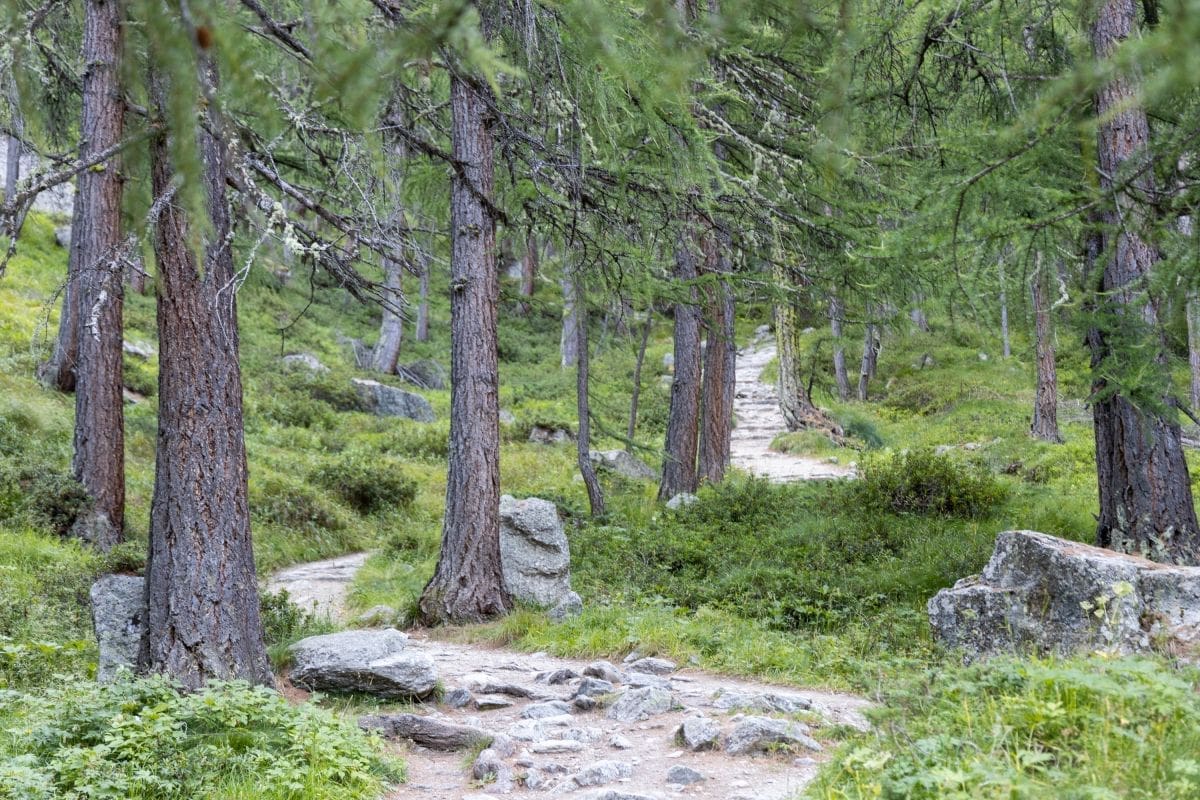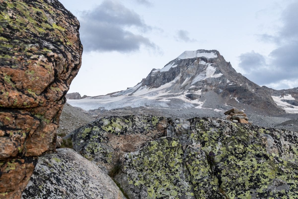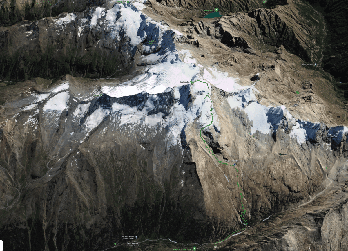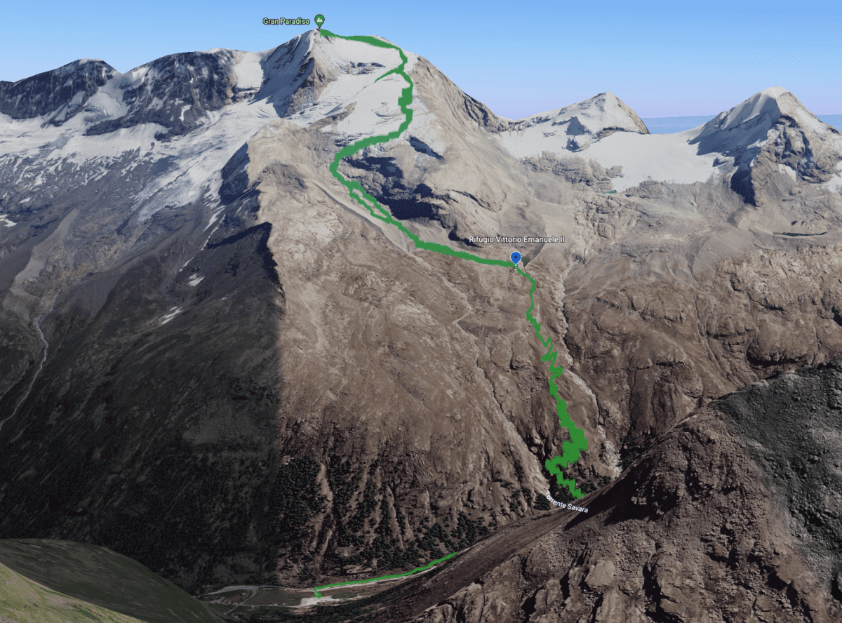 Staza nije označena klasičnim markacijama, već naslaganim gomilama kamenja, a vodi preko velikih granitnih kamenih blokova do početka ledenjaka Ghiacciaio del Gran Paradiso na visini od 3400 m. Tu je potrebno navući dereze i uspon se nastavlja u navezu povremenim korištenjem cepina.