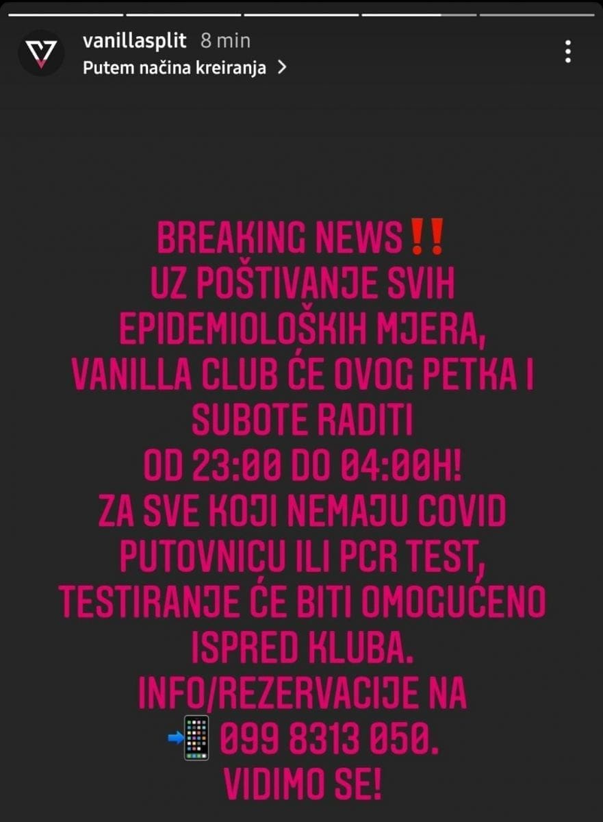"Breaking news". Uz poštivanje svih epidemioloških mjera, Vanilla club će ovog petka i subote raditi od 23 do 4:00! Za sve koji nemaju Covid putovnicu ili PCR test, testiranje će biti omogućeno ispred kluba", stoji u obavijesti kluba.