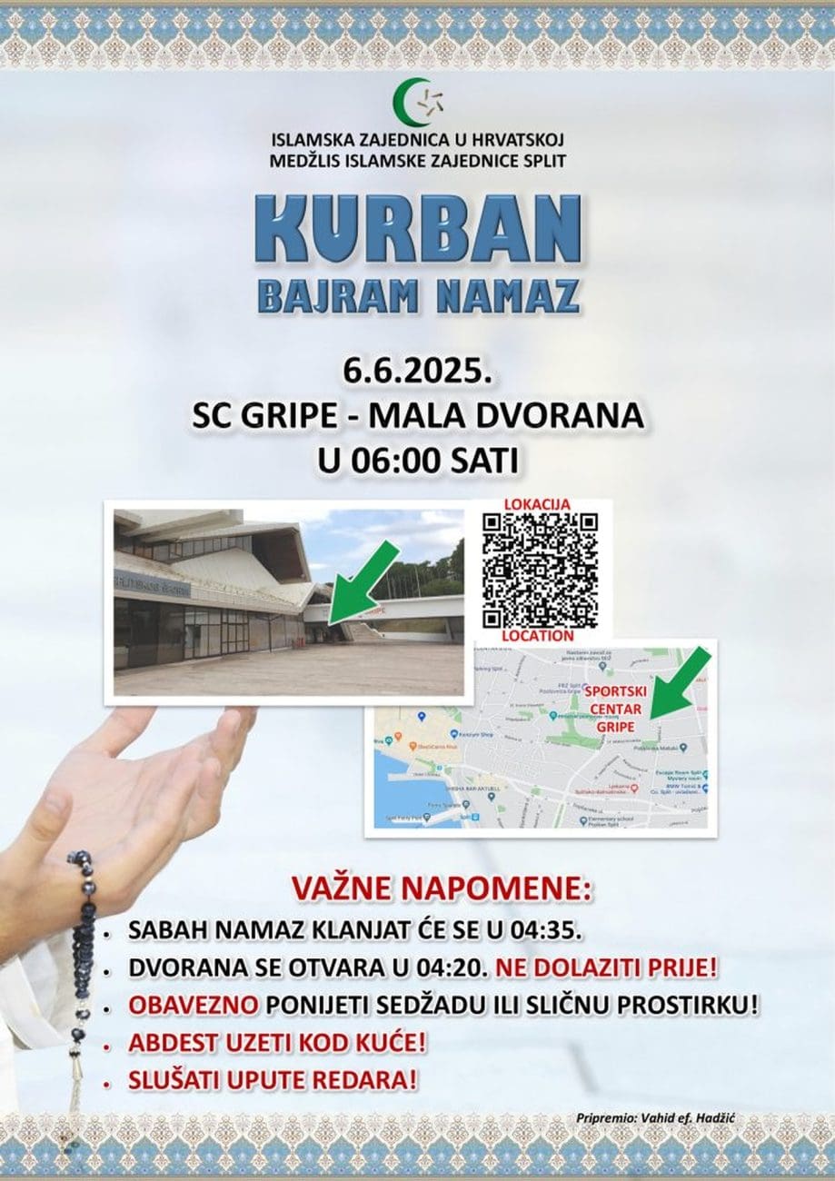 Medžlis Islamske zajednice Split obavještava vjernike da će se povodom Kurban bajrama, najvažnijeg islamskog vjerskog blagdana, zajednički bajram-namaz klanjati u petak, 6. lipnja 2025. godine, u maloj dvorani Sportskog centra Gripe s početkom u 06:00 sati.