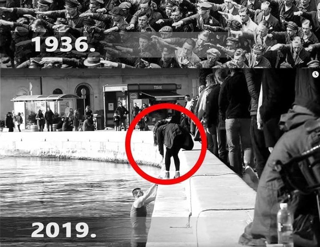 Čin djevojke koja od mnoštva okupljenih na Rivi jedina daje ruku vaterpolistu koji je u bijegu napadača spas potražio u hladnom moru usporedio je s fotografijom muškarca koji je jedini u rulji odbio ispružiti desnu ruku kao što su to učinili nacisti oko njega.