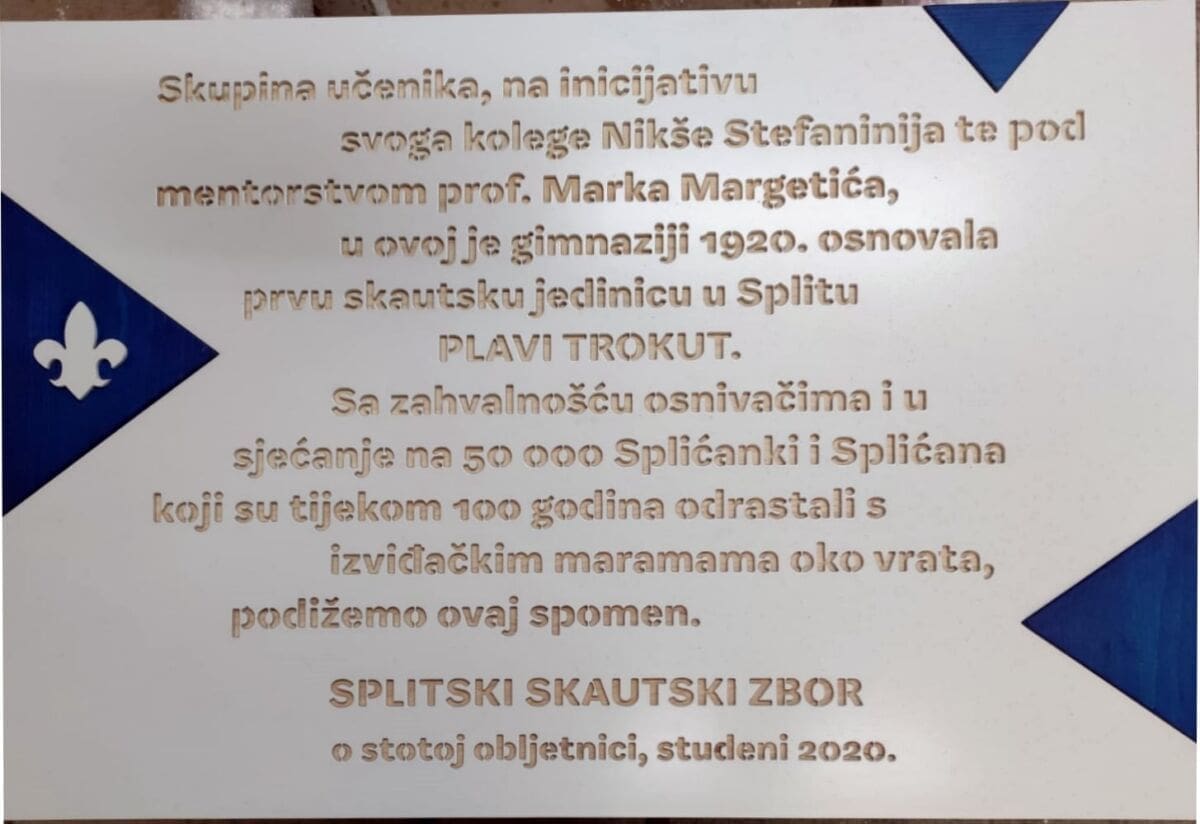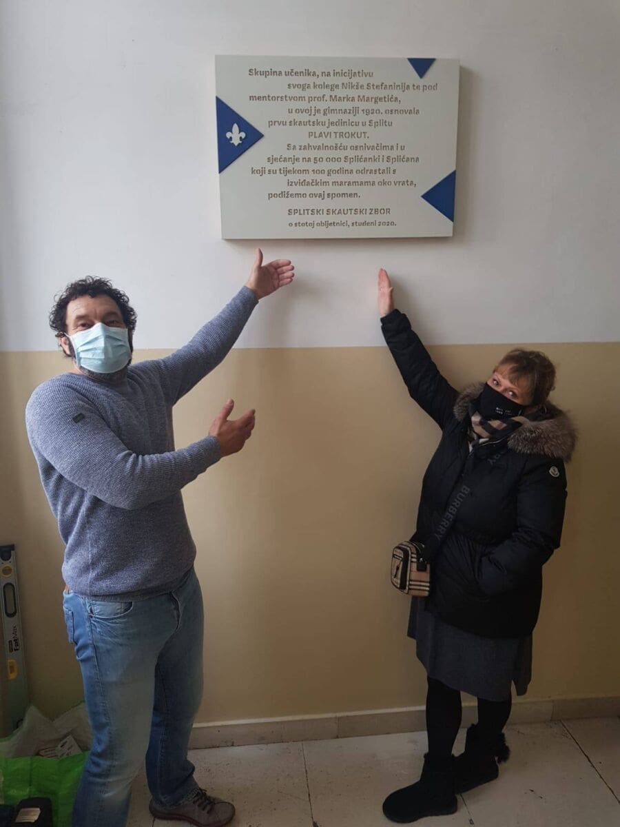 - Moram ovim putem istaknuti dobru volju i pomoć ravnateljica tih škola, SD županijskog odjela, ali i Grada Splita. Spomen ploča postavljena je na izuzetno vidljivom mjestu, jer je upravo u ovoj gimnaziji osnovana prva skautska jedinca u Splitu. Zvala se „Plavi trokut“, a osnovao je Nikša Stefanini, tadašnji učenik gimnazije, a mentor mu je bio profesor Marko Margetić. Oni su ovu lijepu priču pokrenuli davne 1920. godine - objašnjava nam Perić.