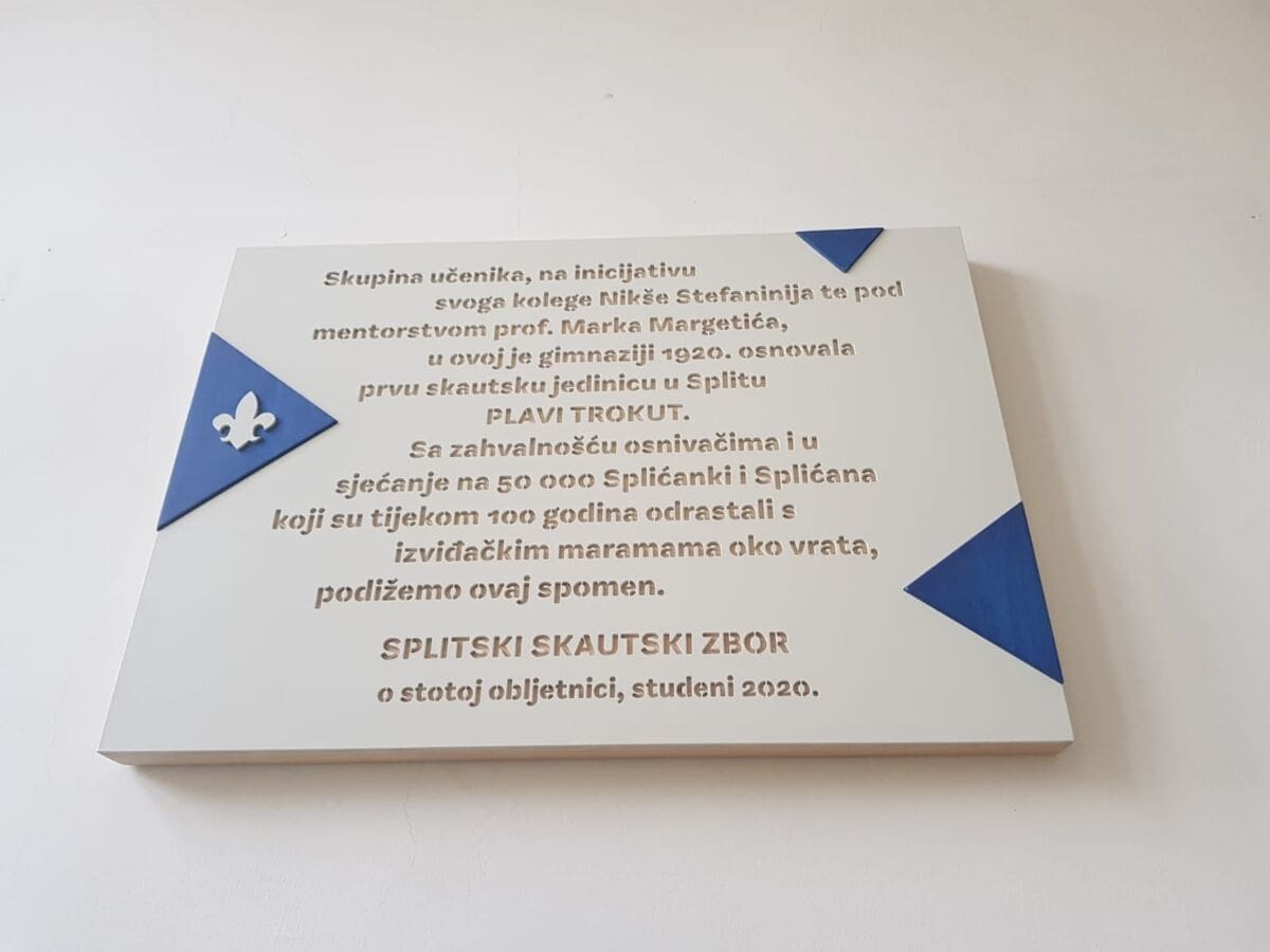 Spomen ploča u čast stogodišnjice splitskog skautizma postavljena je u zgradi IV. i V. gimnazije u Splitu.