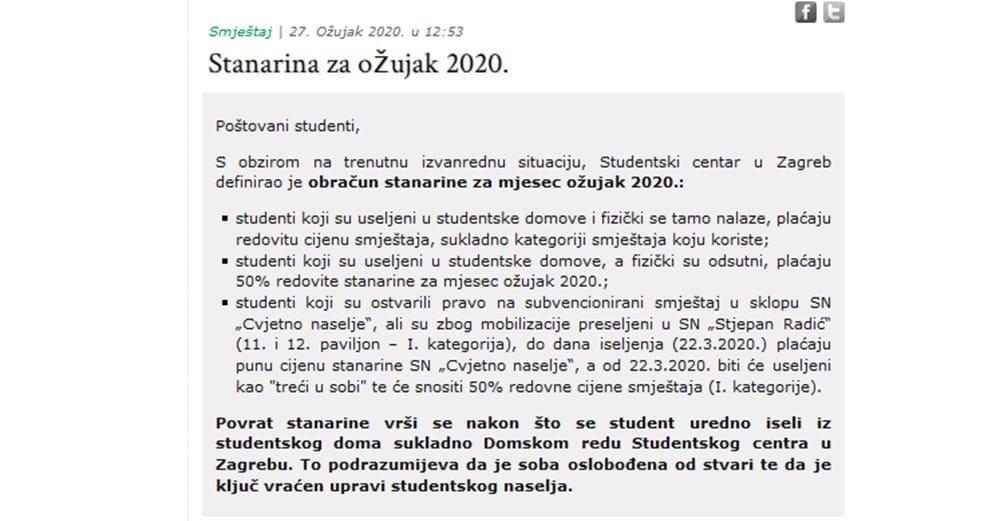 Studenti koji su nas kontaktirali kažu da je uprava doma bila obavještena da odlaze. Diljem kampusa je, dodaju, 17. ožujka osvanula obavijest kojom Studentski centar poziva sve one koji su ostali u domskom smještaju da im se jave.