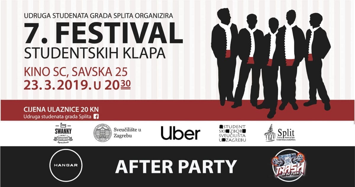 7. Festival studentskih klapa u organizaciji Udruge studenata grada Splita održat će se u subotu 23. ožujka u prostorima Kina Studentskog Centra u Zagrebu (Savska 25) s početkom u 20:30 sati.