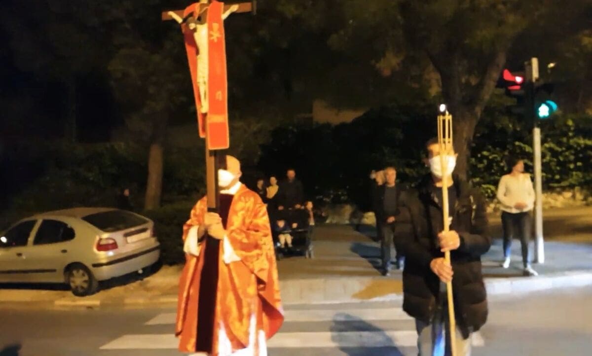 Održao je obrede pred samo nekoliko časnih sestara, a bez puka koji je sve mogao pratiti preko župnog YouTube kanala. Zanimljivo, dok je hodao noseći križ, mnogi su vjernici izašli na prozore, molili se, palili svijeće. Bilo je i onih koji su kleknuli uz cestu za vrijeme prolaska svećenika. U župnu crkvu vratio se oko 21 sat.