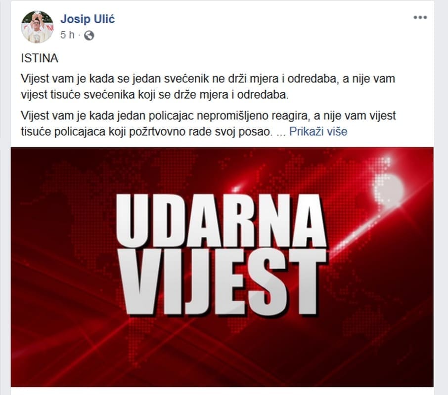 Don Josip Ulić, župni vikar u župi sv. Spasa na splitskim Mejašima na Facebooku je podijelio status pod nazivom "istina". Komentirao je kakve vijesti dominiraju medijima, a njegovu objavu pročitajte u nastvku u cijelosti: