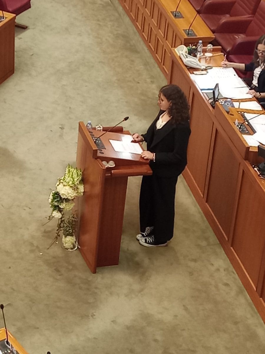 - gimnaziju Split predstavljalo je sedam učenika: Kate Jurišić, Marko Kusanović, Lara Mimica, Issa Peribonio, Lucija Perišić, Maja Šćepanović i Mislav Šolić. Učenice Issa Peribonio i Lucija Perišić su imale izlaganje u ime Odbora za obitelj, mlade i sport te u ime Odbora za obrazovanje, znanost i kulturu, dok su Marko Kusanović i Lara Mimica govorili pojedinačno, u obliku replike.