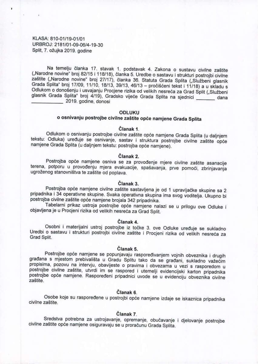 Prijedlog odluke o osnivanju postrojbe opće namjene civilne zaštite Grada Splita.