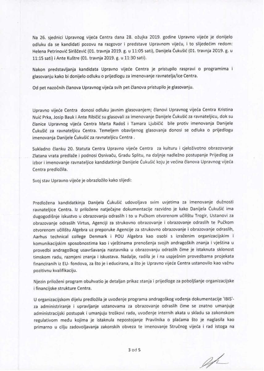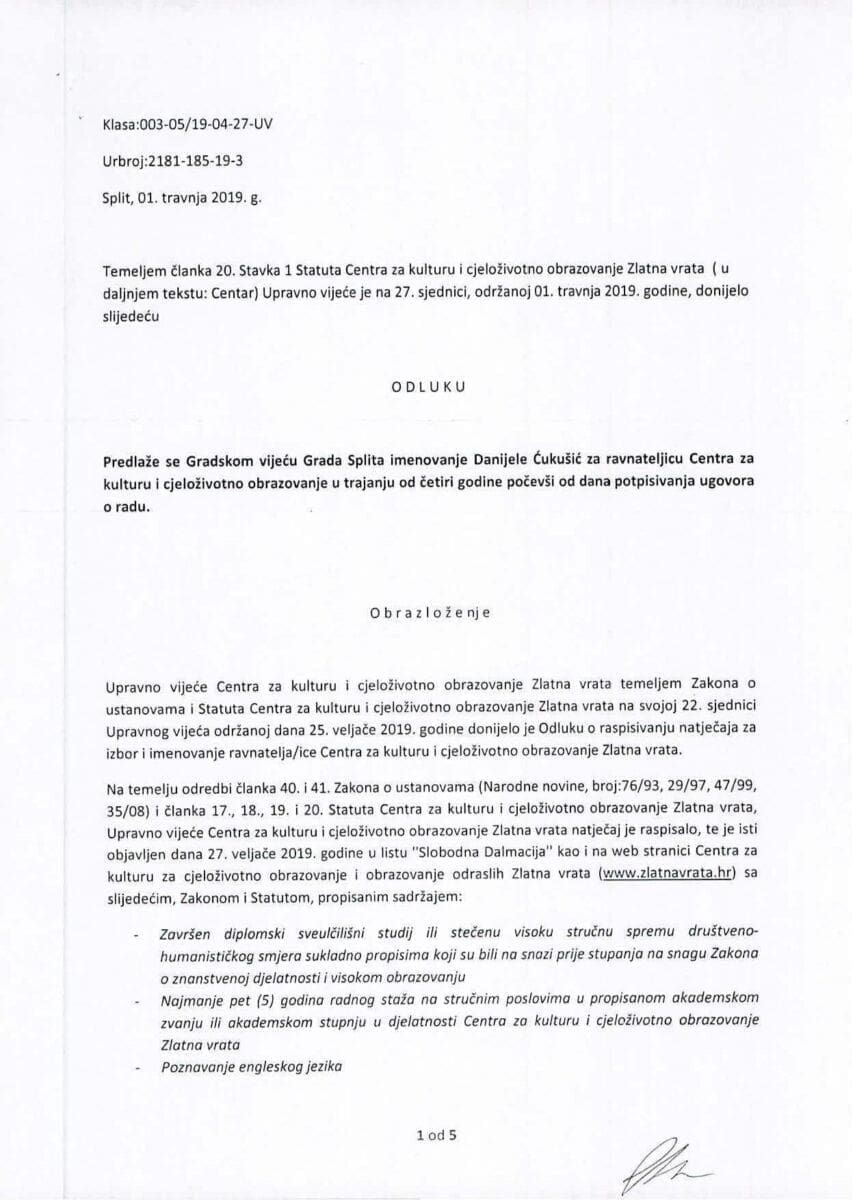 Predoženo je da se za ravnateljicu Centra za kulturu i cjeloživotno obrazovanje Zlatna vrata imenuje Danijela Ćukušić.