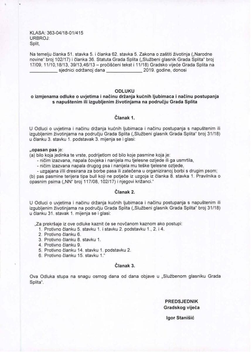 Prijedlog Odluke o izmjenama Odluke o uvjetima i načinu držanja kućnih ljubimaca i načinu postupanja s napuštenim ili izgubljenim životinjama.