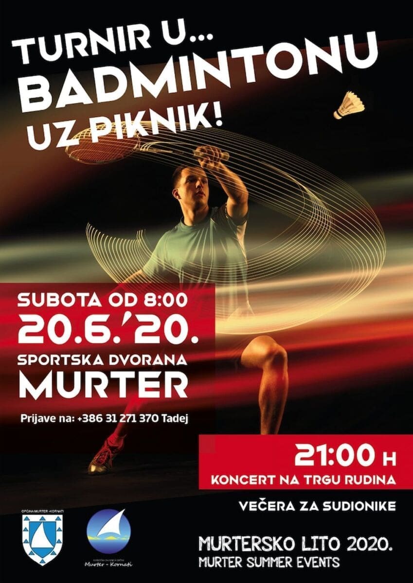Badminton potječe iz Engleske, dinamičan je natjecateljski i standardni olimpijski sport u kojem se susreću ili dva pojedinca ili dva para, te traži izdržljivost, snagu i brzinu. “Službeno” se igra u pet kategorija: pojedinačno žene i muškarci, ženski i muški parovi, te mješoviti parovi, no također je vrlo raširen vid rekreacije, pogodan i za igru u prirodi, bez mreže ili pravila. Domaćina- natjecatelja iz Murtera, kako saznajemo, do ove godine nije bilo, ali se očekuje dolazak igrača rekreativaca iz susjednog Šibenika.
