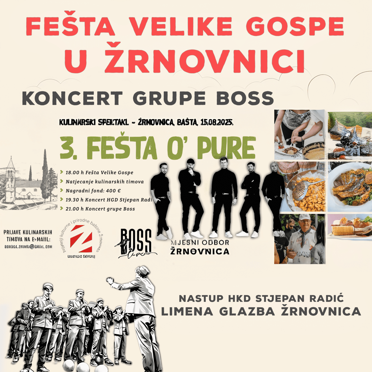 Žrnovnica danas, na blagdan Velike Gospe, slavi svoj dan. Organizator glavnog događaja, koncerta grupe Boss s počekom u 21 sat u Bašti je Mjesni odbor Žrnovnica. Međutim, zbivanja na ovoj lokaciji počet će znatno ranije i to u 18 sati kada počinje Fešta o'pure, treće izdanje kulinarskog spektakla u organizaciji udruge Žrvanj. Ove godine rekordan broj prijavljenih timova natječe se u spremanju raznih specijaliteta od mesa, ribe, povrća, ali u kombinaciji s purom mljevenom u Antoničinom mlinu.