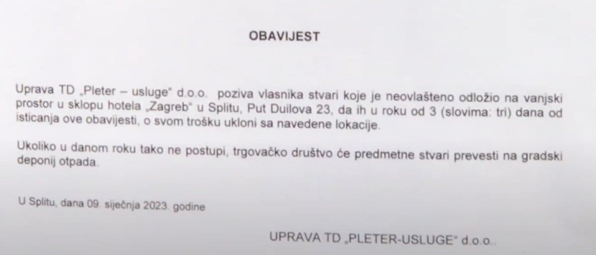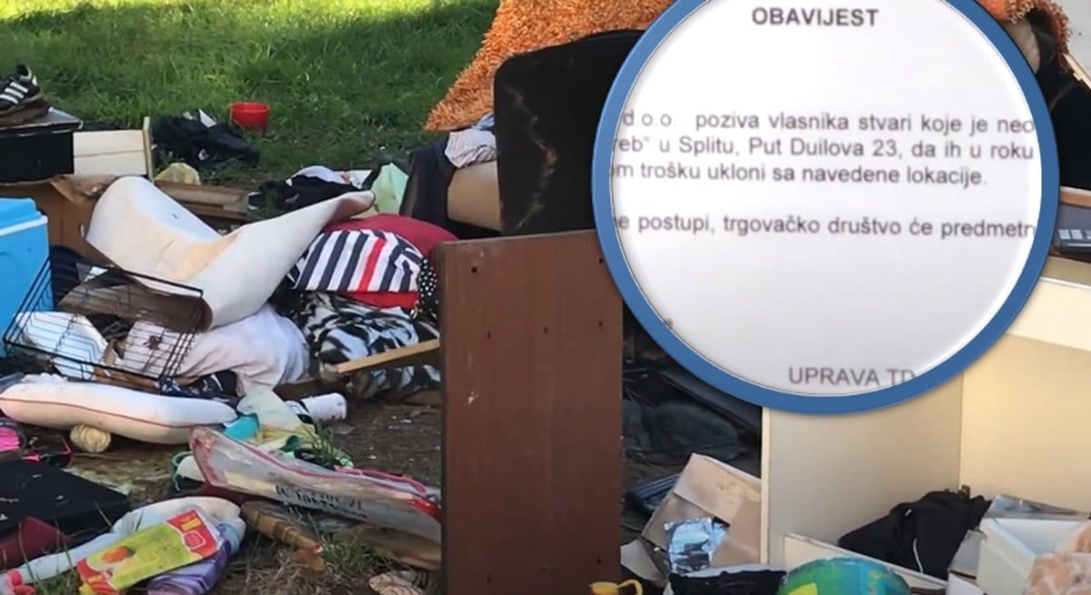Naime, tvrtka “Pleter” zamolila je nepoznatog odlagatelja stvari i parku na splitskom predjelu Duilovo da sve pokupi i odnese. No, molba zasad nije uslišana i stvari i dalje stoje uz jedan od objekata ispred hotela Zagreb.