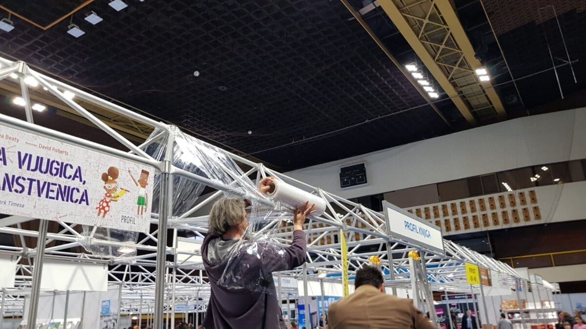 Čitatelj Dalmacija Danas poslao nam je video i fotografije na kojima je vidljivo kako radnici sajma štite izložene knjige improviziranim nadstrešnicama od najlona. Da, dobro ste pročitali, iako se sajam održava u zatvorenom prostoru, krov u toj mjeri prokišnjava, da je neke štandove bilo potrebno natkriti.