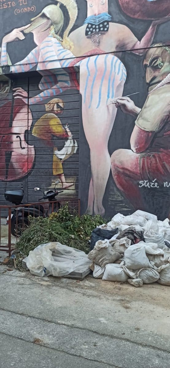 Fasadu ateliera Hrvatskog narodnog kazališta Split u Plinarskoj ulici, osim murala 'Možda bi vam bolje bilo da niste tu', krasi i građevinski otpad.