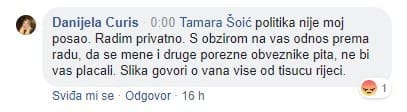 Dok čekamo odgovore, bilo je teško ne primijetiti zanimljiv diskurs Danijele Curiš, članice Središnjeg odbora HNS-a, u raspravi s nekolicinom nastavnika u kojoj sugovornicima imputira da omalovažavaju kolege koji rade na reformi. Jednoj od znatiželjnih nastavnica Curiš je odgovorila: „Politika nije moj posao. Radim privatno. S obzirom na vaš odnos prema radu, da se mene i druge porezne obveznike pita, ne bi (sic!) vas plaćali. Slika govori o vana (sic!) više od tisuću riječi.“
