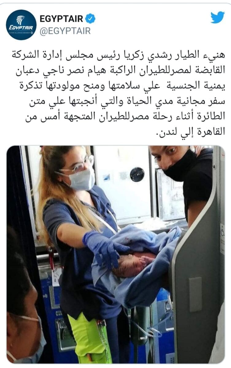 Majka Hayam Nasr Nagi Daaban iz Jemena letjela je iz Kaira u London zrakoplovom EgyptAir MS777. Usred leta započeo je prijevremeni porod. Kapetan zrakoplova preusmjerio je avion prema zračnoj luci u Münchenu, no beba je ipak bila brža te sigurno došla na svijet na putu do njemačke zračne luke. Bebu je porodio liječnik koji je bio putnik u avionu.