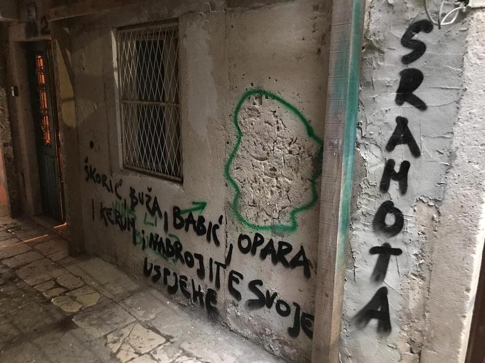 Na obližnjim zidovima netko je ispisao poruke konzervatorima i gradskoj vlasti. Pozivaju ih da nabroje vlastite uspjehe. Osim Radoslava Bužančića koji je izdao nalog za uklanjanje murala Jugoplastici, prozvan je i gradonačelnik Andro Krstulović Opara, Željko Kerum, Petar Škorić i Damir Babić.