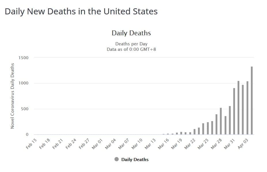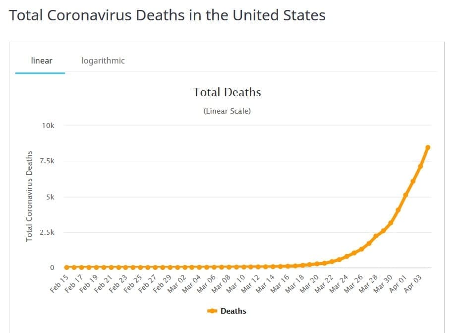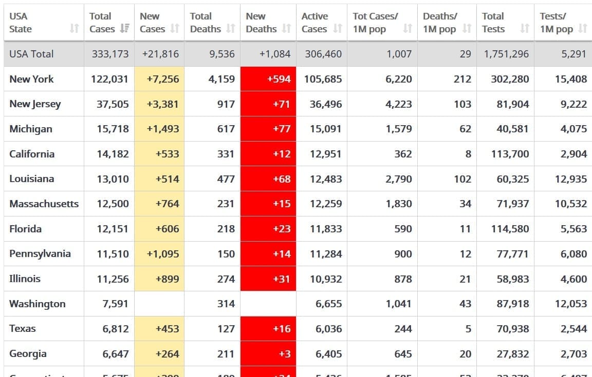 Evidentirano je 1.084 umrlih od posljedica koje se povezuju s koronavirusom, a 8.623 osobe su u kritičnom stanju ili im je zdravlje ozbiljno narušeno. Od početka epidemije u SAD-u je zabilježeno 333.173 slučajeva zaraze, a trenutno je 306.460 aktivnih slučajeva.