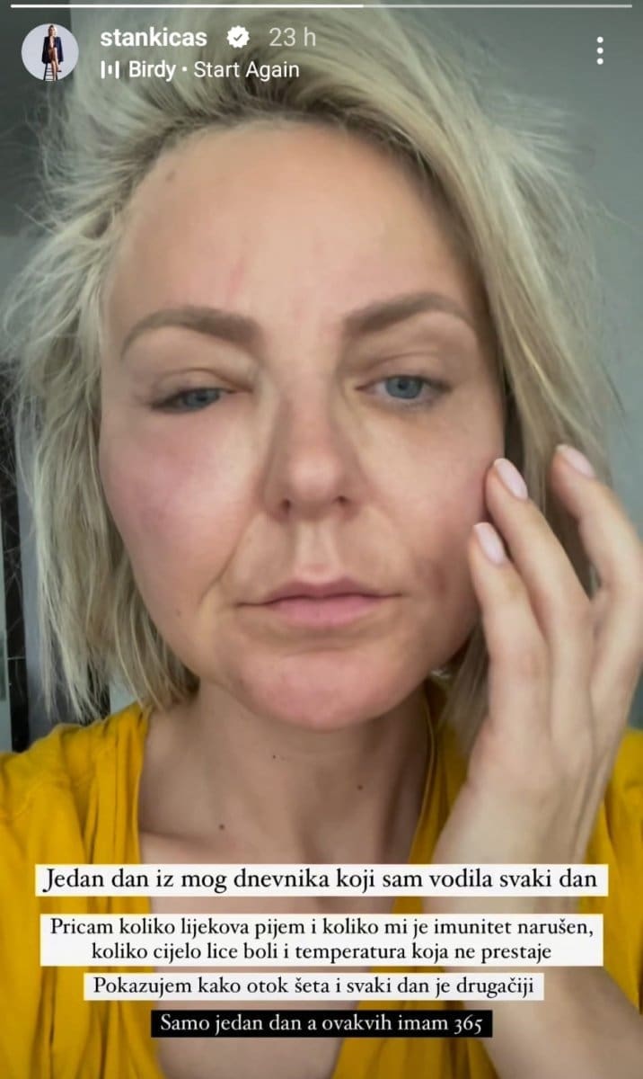 Stankica je sada ponovno progovorila o svom zdravlju. "Jedan dan iz mog dnevnika koji sam vodila svaki dan. Pričam koliko lijekova pijem i koliko mi je imunitet narušen, koliko cijelo lice boli i temperatura koja ne prestaje. Pokazujem kako otok šeta i svaki dan je drugačiji. Samo jedan dan, a ovakvih imam 365", napisala je uz fotografiju svog natečenog lica.