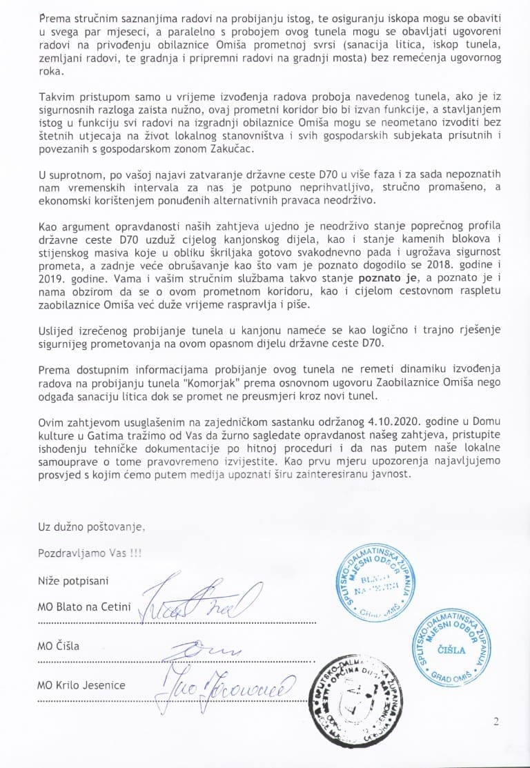 - Previše patimo financijski, vremenski, a da nam nitko nije ponudio alternativu, pa niti brod kojim bi prolazili učenici. Pregovori oko postavljanja pontonskog mosta su okončani jer ne zadovoljava sigurnosne standarde, ali mi smo ponudili rješenje – probijanje tunela Lisičina od Omiša prema Zakučcu, kao jedno dugoročno rješenje za postojeću DC70. Taj tunel od 300-tinjak metara (iza hotela Dvor s omiške strane te bi izlazio prema skretanju za HE Zakučac sa sjeverne strane kanjona) bi zamijenio postojeću dionicu koja prolazi kroz kanjon, između stijena i same Cetine. Cesta DC70 u tom je dijelu suženog profila, jedva se mimoilaze dva tegljača, da ne spominjem pješake ili bicikliste... Tu često dolazi do odrona zbog oborina pa je opet ta dionica zatvorena, dok bi se probijanjem ovog tunela potpuno riješila povezanost Omiša sa zaleđem, tunela čija je trasa do 2013. godine bila u Prostornim planovima Grada Omiša... Jer nije samo problem u ovih 45 dana ili više, već što će se nekoliko puta zatvarati cesta zbog radova, a u gospodarskoj zoni Zakučac postoje brojne firme te pogoni koji će biti direktno pogođeni, neki od njih najavljuju smanjivanje zaposlenika, ako ne potpuno zatvaranje. Da ne govorim kako su u zaleđu brojna mjesta u kojima ljudi doista žive, stanuju, doseljavaju mlade obitelji jer im je Omiš kojem gravitiraju te koji je administrativno središte jako blizu. Iz HC-a nisu zauzeli stav vezano za gradnju tunela, čije bi probijanje koštalo oko osam milijuna kuna, dok bi kompletno uređenje bilo između 20 i 25 milijuna kuna. Ali kad bi se jednom probio, to bi bilo trajno rješenje za ovu cestu koja ljeti na dnevnoj razini bilježi prosjek od 8.300 vozila! I da naglasim, apsolutno podržavamo i svjesni smo važnosti izgradnje Omiške zaobilaznice, ali koridor kojim prolazi DC70 je preznačajan za širi kraj te također zaslužuje trajno rješenje... - argumentirao je stav “pobunjenih” mještana Denis Dujmović.