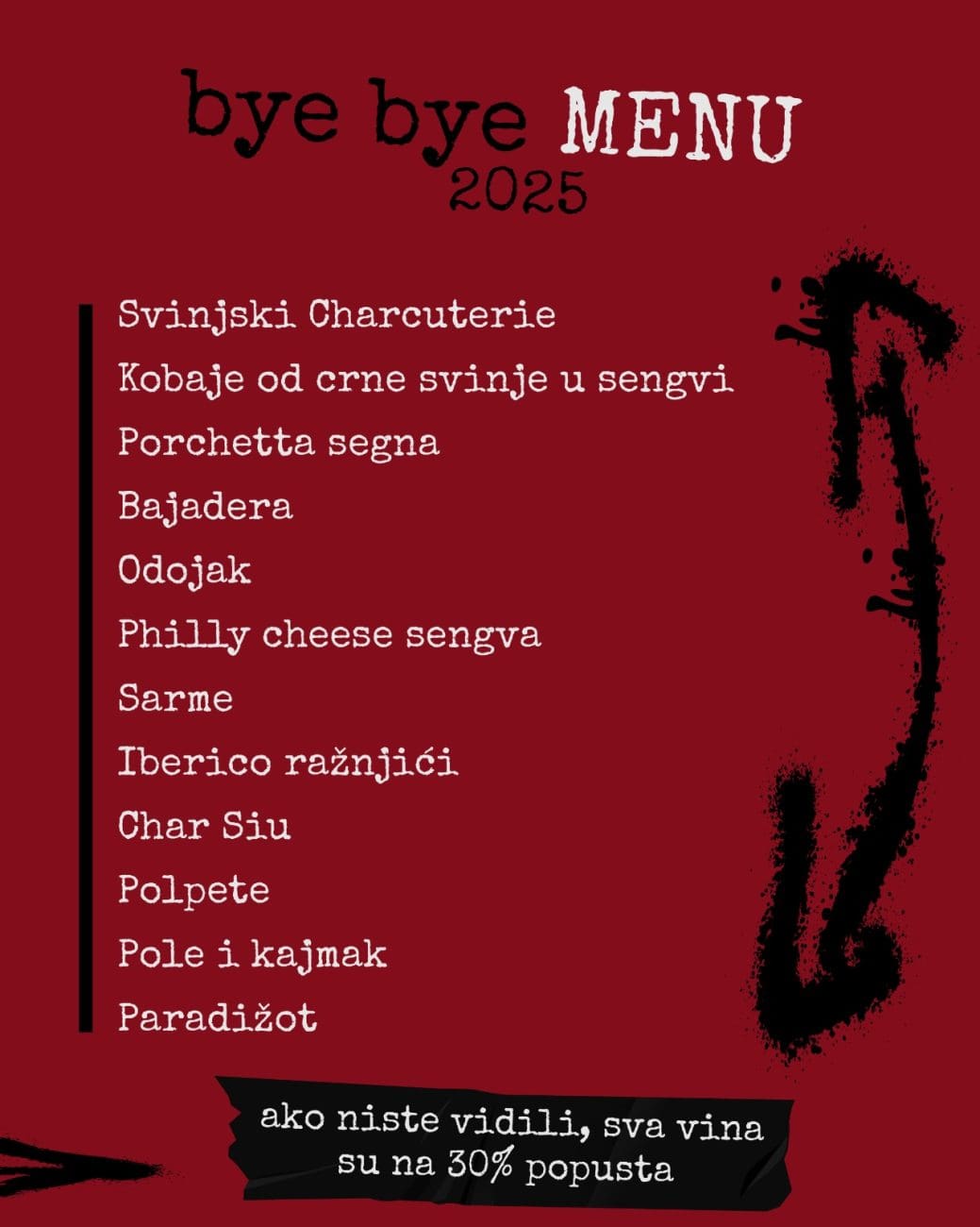 Na stolu – sve šta triba bit. Svinjski charcuterie za zagrijavanje. Kobaje od crne svinje u sengvi koje nestaju bez pitanja. Porchetta sengva koja se jede bez priče. Bajadera, odojak, Philly cheese sengva, sarme za one koji znaju da triba malo balansa. Iberico ražnjići, char siu, polpete, pole s kajmakom – i paradižot za kraj, jer godina se zatvara slatko ili nikako.