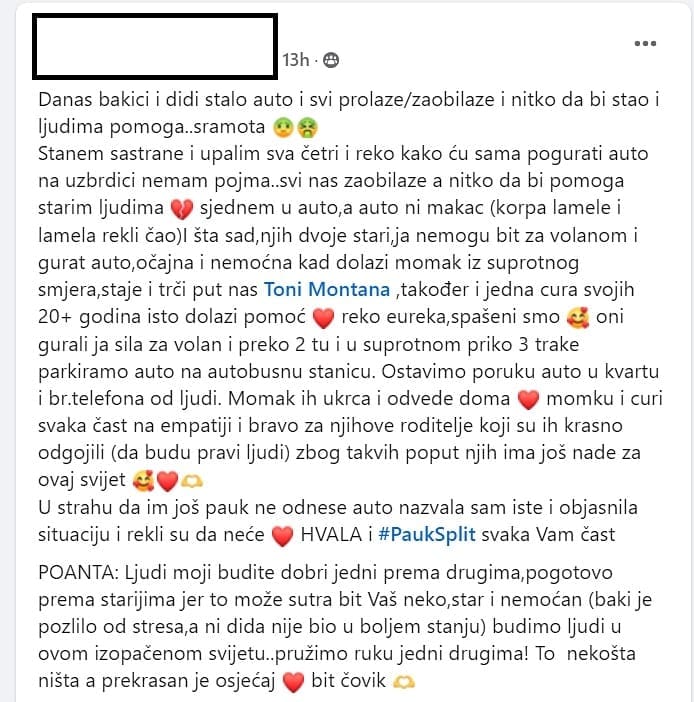 Stanem sa strane i upalim sva četri i reko kako ću sama pogurati auto na uzbrdici nemam pojma... Svi nas zaobilaze a nitko da bi pomoga starim ljudima sjednem u auto, a auto ni makac (korpa lamele i lamela rekli ćao)I šta sad, njih dvoje stari, ja ne mogu bit za volanom i gurat auto, očajna i nemoćna kad dolazi momak iz suprotnog smjera, staje i trči put nas Toni Montana također i jedna cura sa svojih 20+ godina isto dolazi pomoć. Reko eureka, spašeni smo oni gurali, ja sila za volan i preko 2 tu i u suprotnom priko 3 trake parkiramo auto na autobusnu stanicu. Ostavimo poruku auto u kvartu i br. telefona od ljudi", stoji u objavi na jednoj policijskoj grupi.