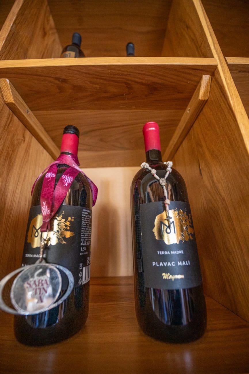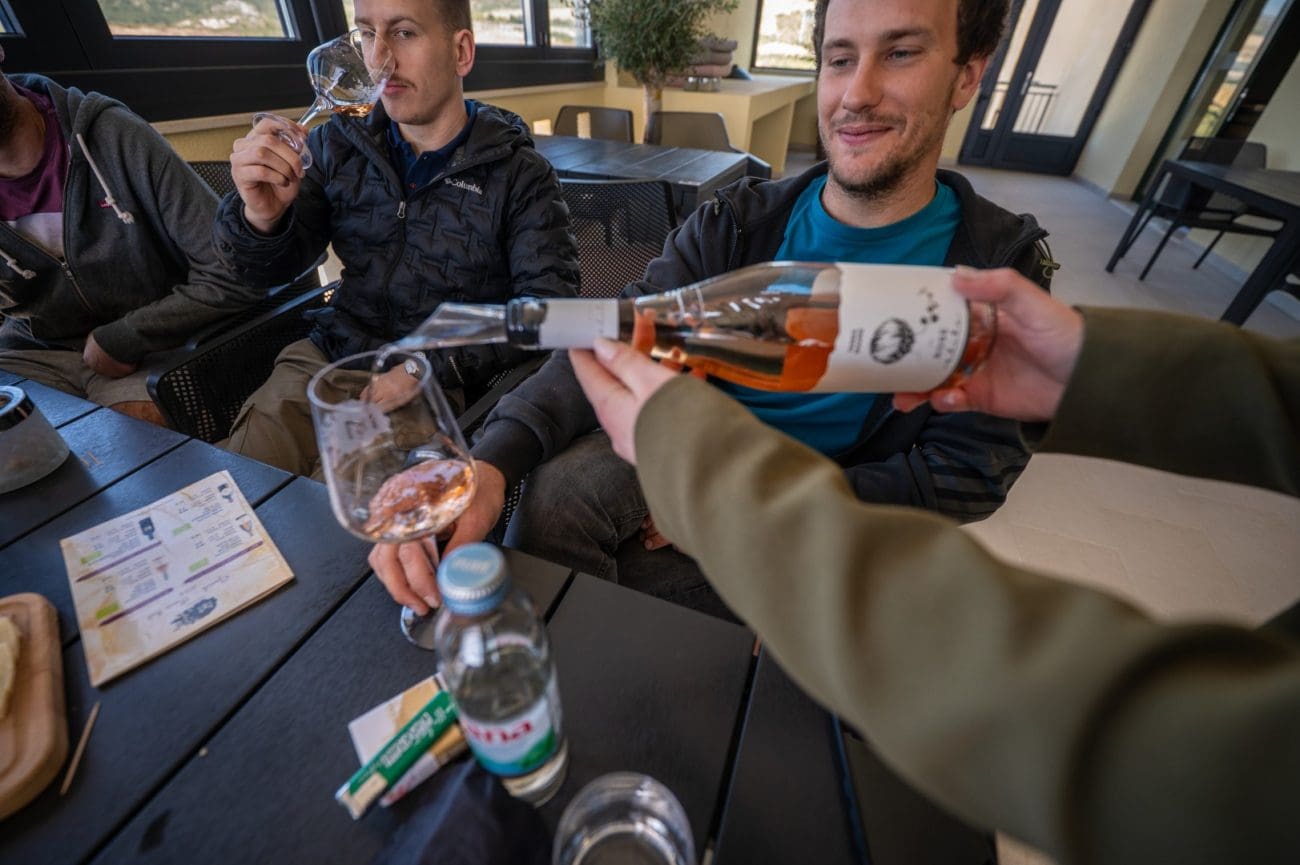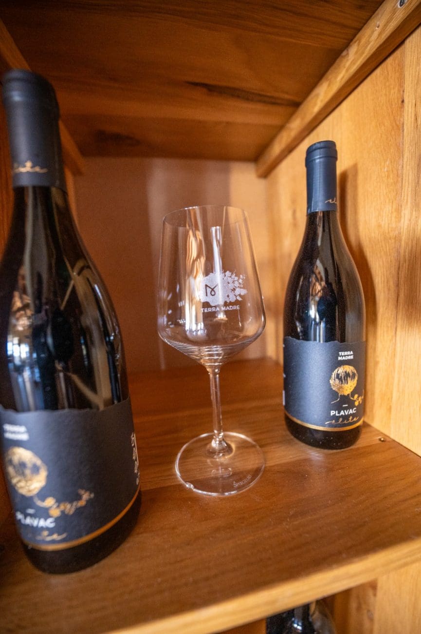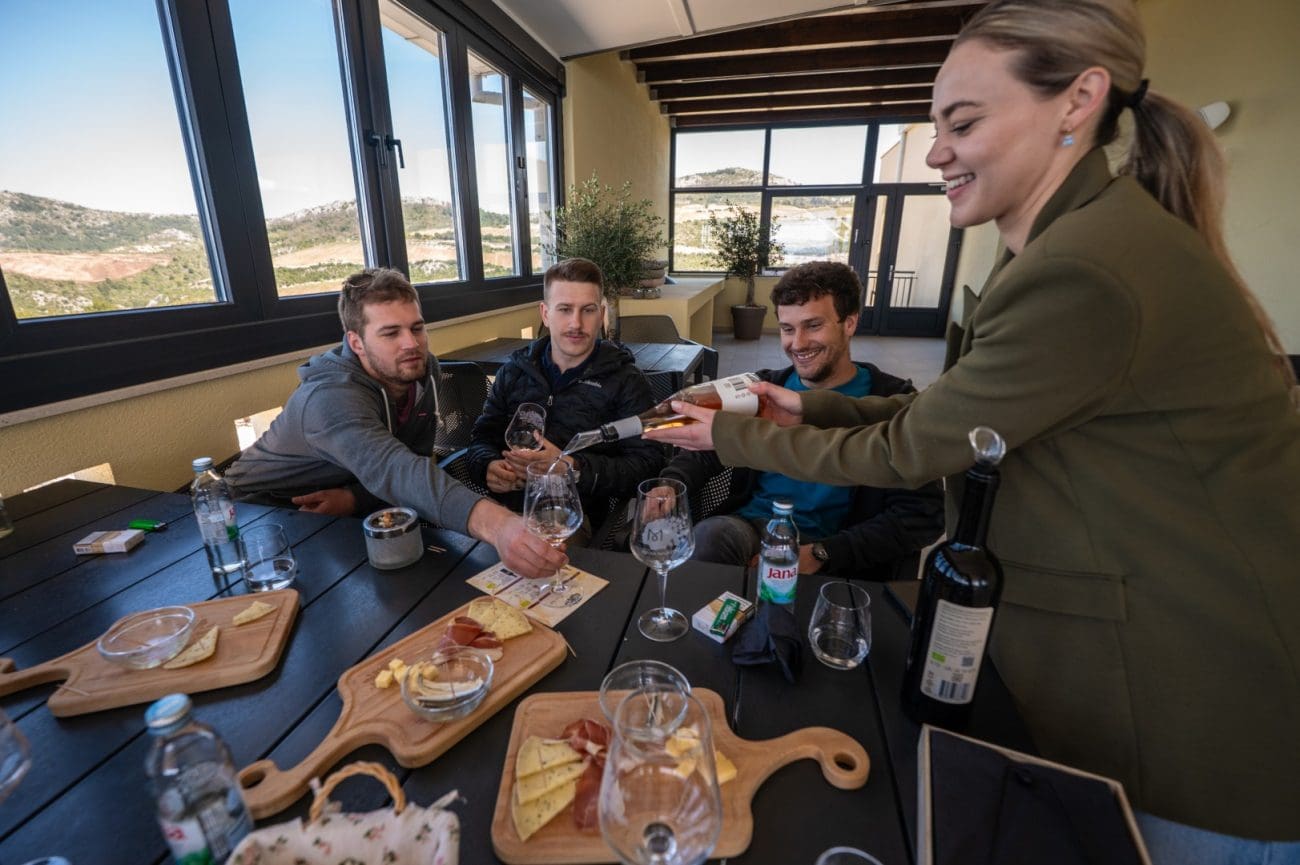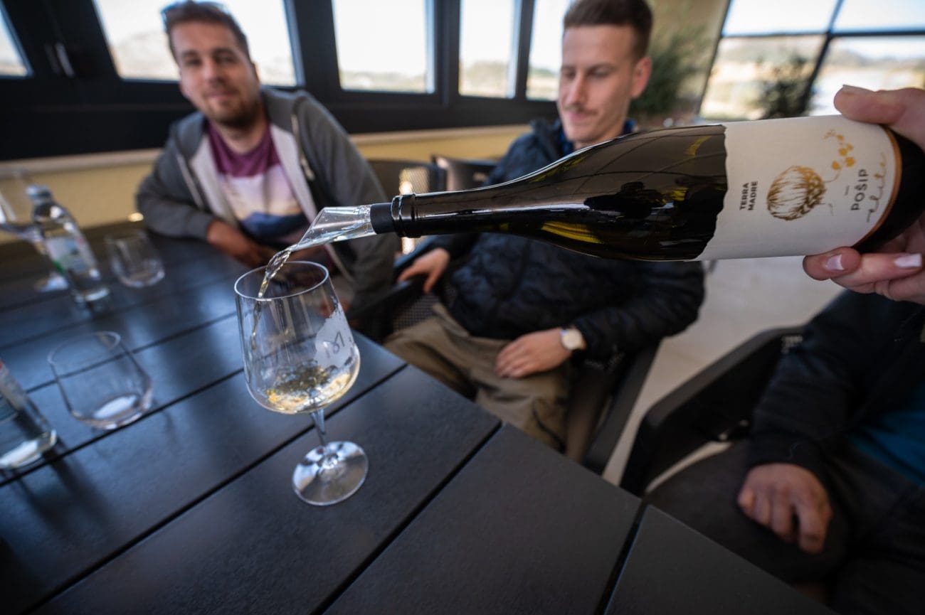 Degustacija ovdje nije brza stanica nego mala dalmatinska siesta: na drveni pladanj stižu pršut, slane srdele, dalmatinski sir, te je degustacija nagrađenih vina mogla je početi. U tom trenutku shvatite zašto su vlasnici, kad su 2009. prvi put raskrčili ovaj krš da zasade lozu, projektu dali ime “majka zemlja” – jer je ovdje sve podređeno lozi: kamen crpi toplinu, more vraća vlagu, a bura prozračuje trsje. Kako su padine dio velikog prirodnog kanala, bonaca je ovdje gotovo nepoznat pojam. Uvjerili smo se u to i sami pa smo se usprkos travanjskom suncu sklonili s vjetrovitog dijela terase.
