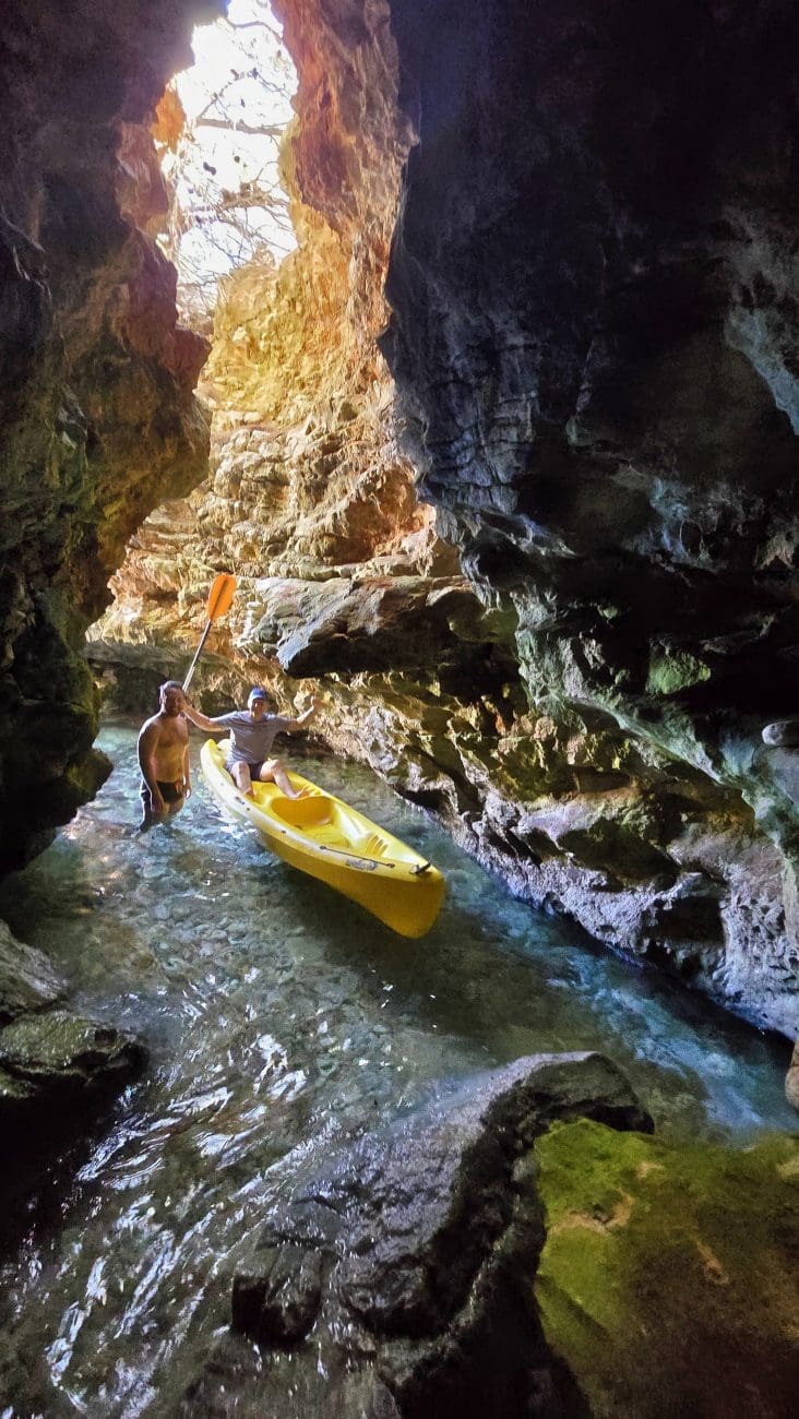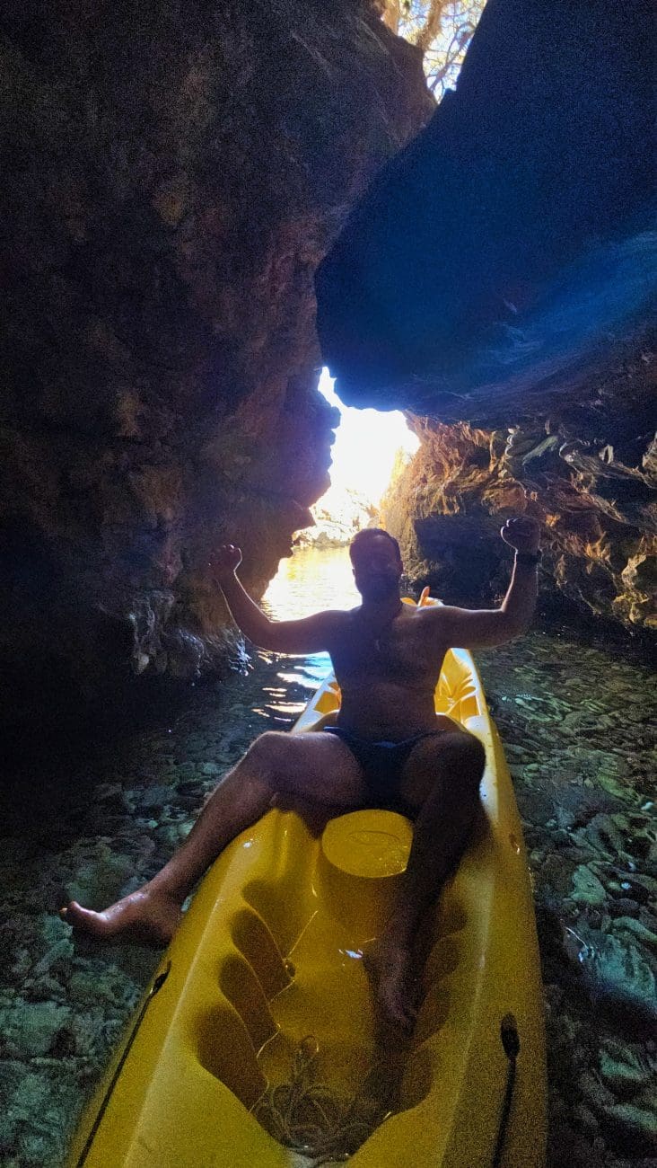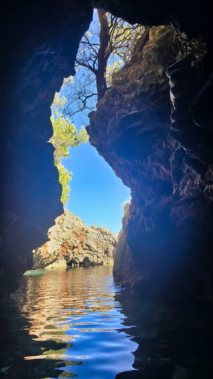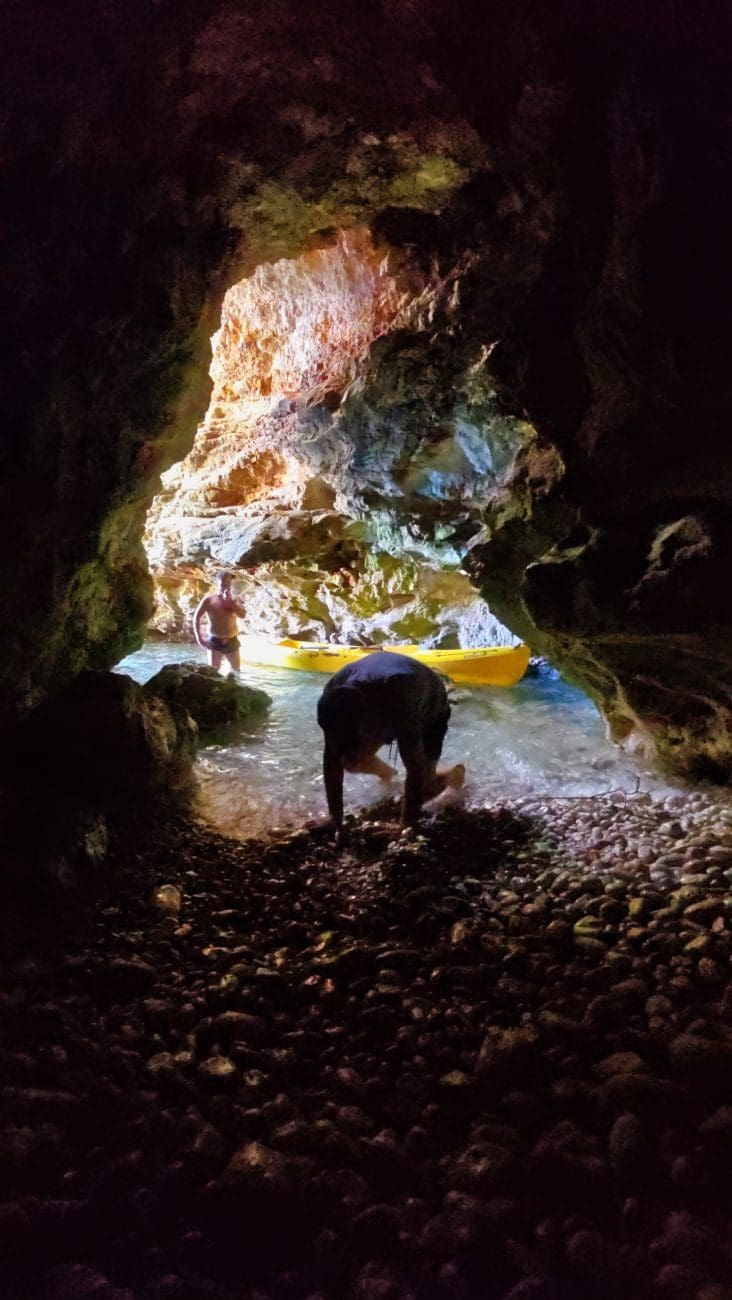 Privezujemo se u predivnoj uvali i plaži Grdača gdje je nekoliko starih ribarskih kućica preuređeno u izrazito lijepe objekte. More je kristalno čisto i bio gušt roniti u morem u kojem se jasno vidi dno i kada nije tako blizu. Od tu nas domaćin kajakom, jednog po jednog, vozi do obližnje grotte (spilje) kojoj neki s mora ne bi ni vidjeli ulaz. Radi se o procijepu obali širokom niti metar među oštrim stijenama. Kada prođete kanal od desetak metara, kanal se počinje lagano širiti, a svog zatvarati. Tada ulazite u malu pećinu na čijem je kraju mala plaža od prirodnih kamenih oblutaka. Osjećaj je neponovljiv, upozorenje tek neiskusnim vozačima kajaka da jako pripaze prilikom ulaska i izlaska uskim kanalom jer ako vas ti uhvate valovi, mogli biste se ozlijediti.