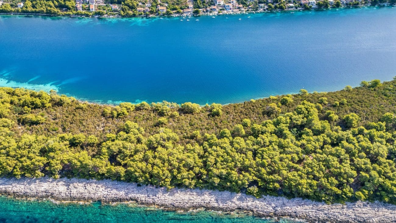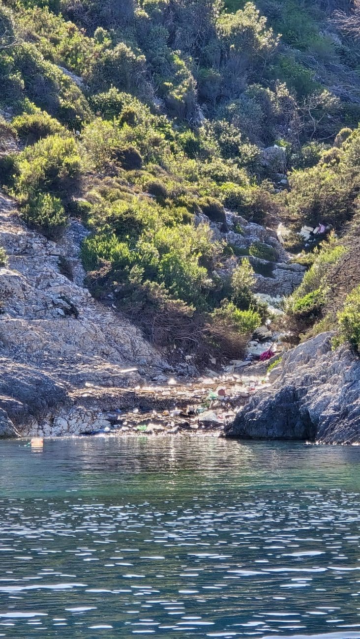 Prolazeći brodom uz obalu divim se krajoliku. Kristalno plavo nebo, pošto je dan prije prošla nevera i očistila zrak, a more je još bilo mirno na ovom dijelu otoka. Boje se urezuju u glavu - plavo nebo, zelena borova šuma, tanki stjenovito dio uz obalu i plavo ili tirkizno more. Dio od uvale Slatina prema Novoj i dalje na istok slabo je naseljen, rekao bih, srećom. Nekoliko vila izgrađeno je tik uz more, a sama priroda naređuje gdje ne graditi. Tako na pojedinim padinama uz more šuma uopće ne može narasti od siline vjetra koji tu često udara. Tamo gdje je šuma gusta i uspravna, kaže priroda, povoljno je mjesto za život. U uvali Nova nailazimo na prizor koji je možda inspirirao Runjića da napiše stih o "suvoj lažini". More je prirodnim putem nabacalo toliko lažine da je nastao prirodni "tepih" koji je predivno vidjeti naspram tolikih neprirodnih "uređenja" obalnih i otočnih vala.