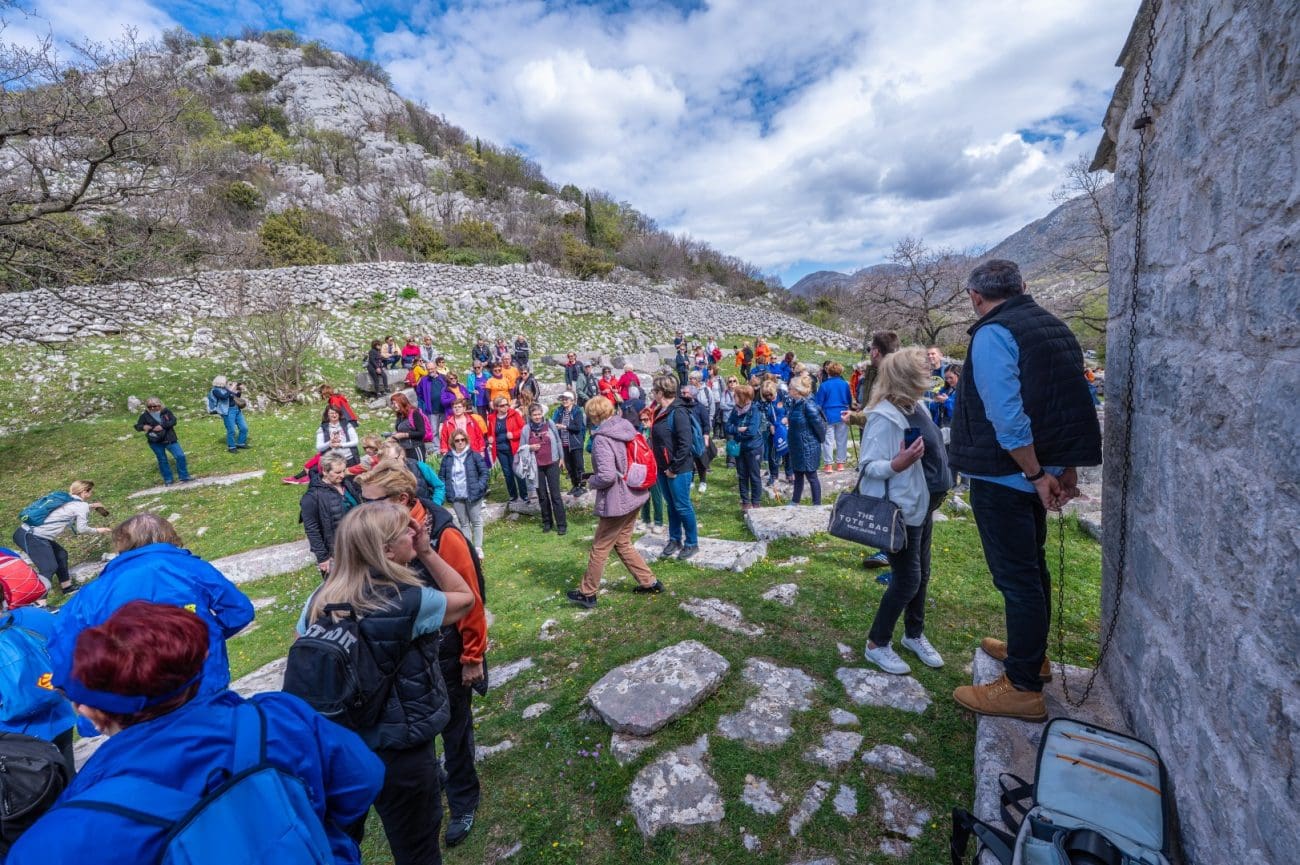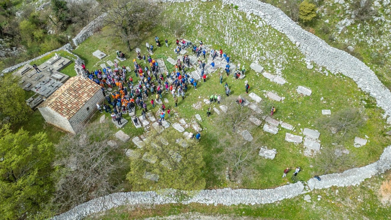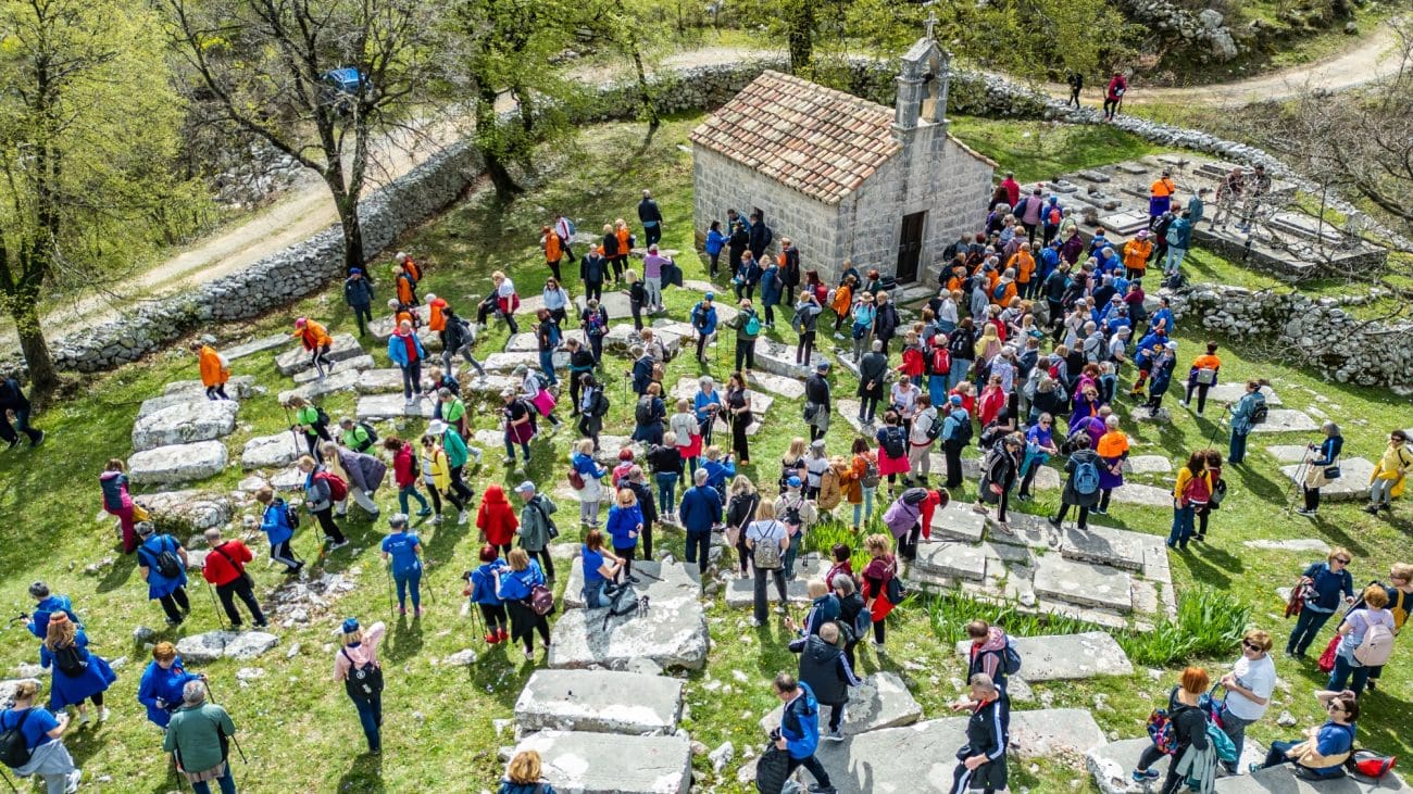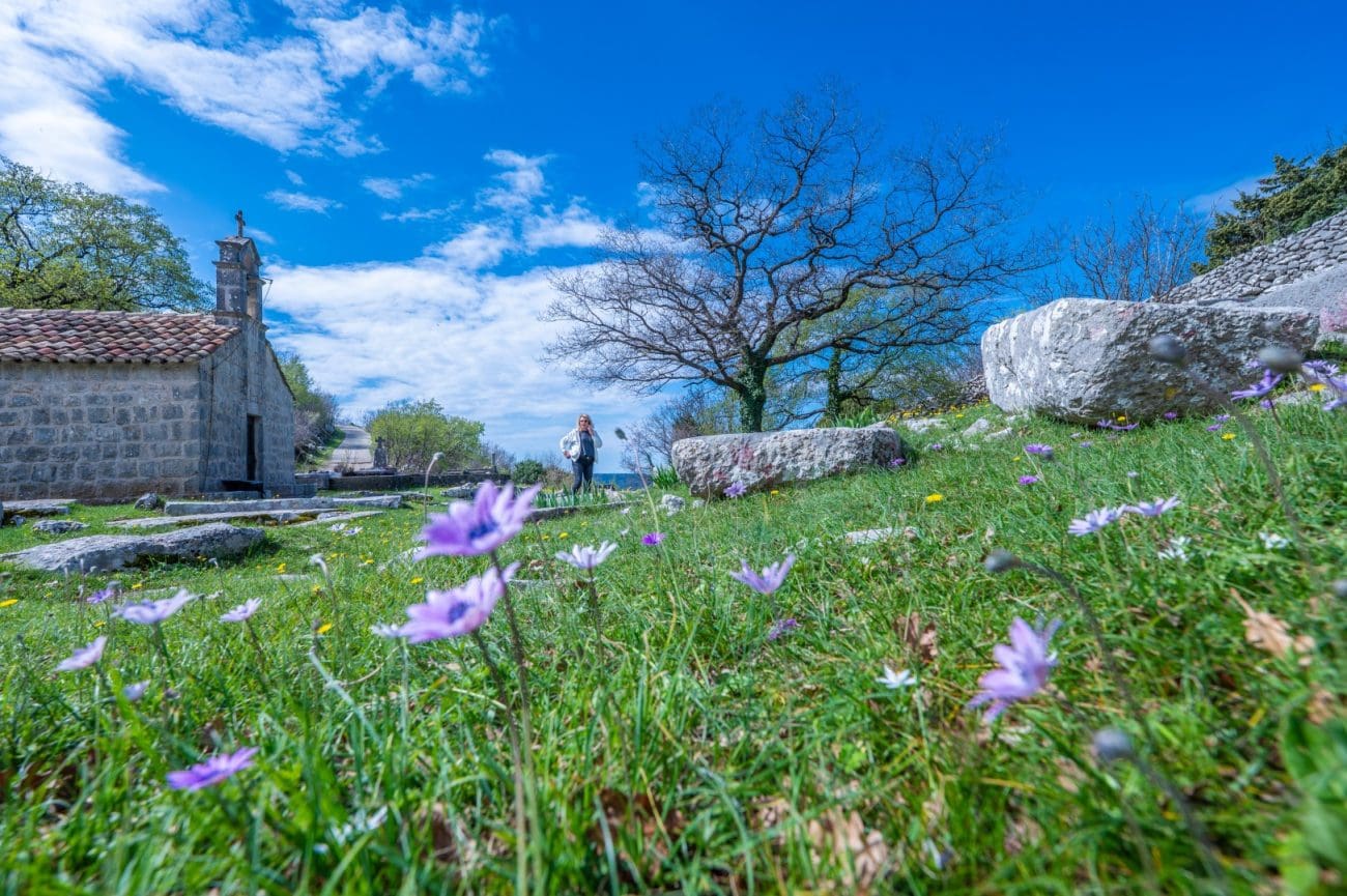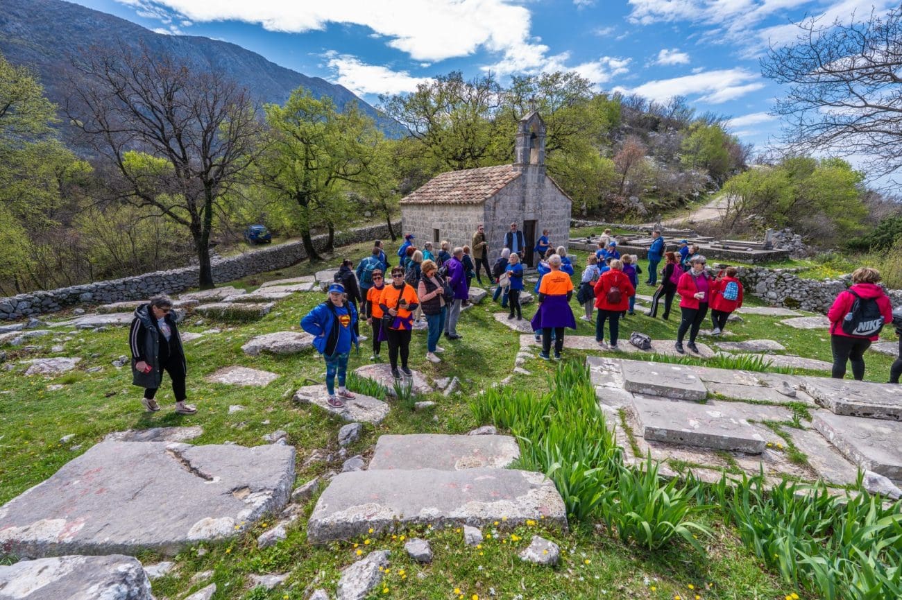 Skromna romanička crkvica podignuta je na mjestu rimskog i ilirskog svetišta. „Ovdje vam se povijest, krajolik i identitet spajaju u jedan kamen“, najavljuje vodič dok se rijeke turista slijevaju iz autobusa. Gosti ga prate stazom posutom borovom iglicom: u blagom usjeku brežuljka otkrivaju se „kamene njive“ – pravilni nizovi ploča i sljemenjaka iz 14. i 15. stoljeća. Neki nose križeve, drugi lovačke prizore, treći plesne motive.