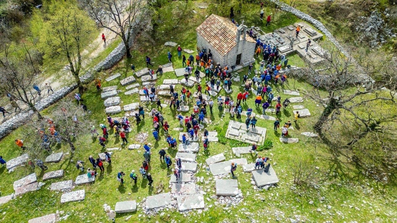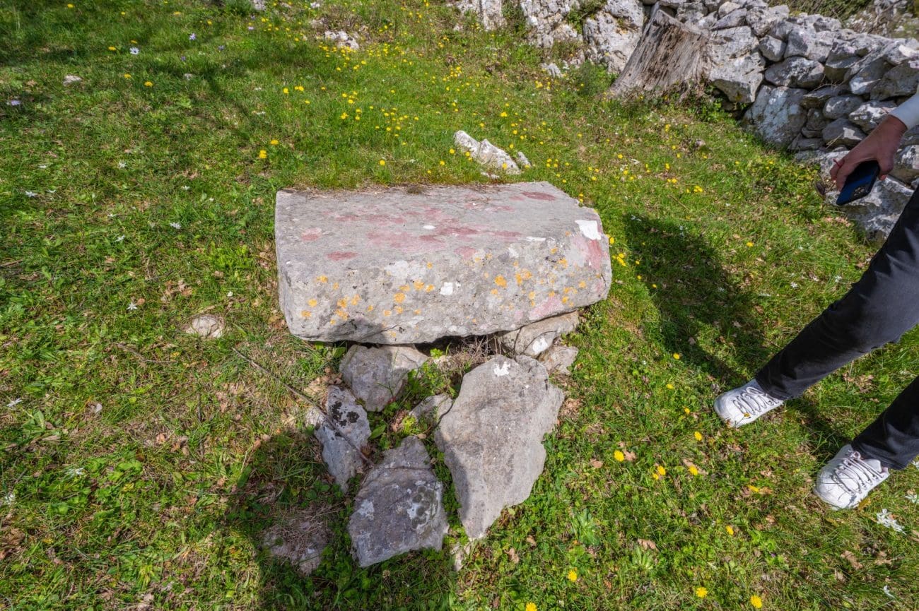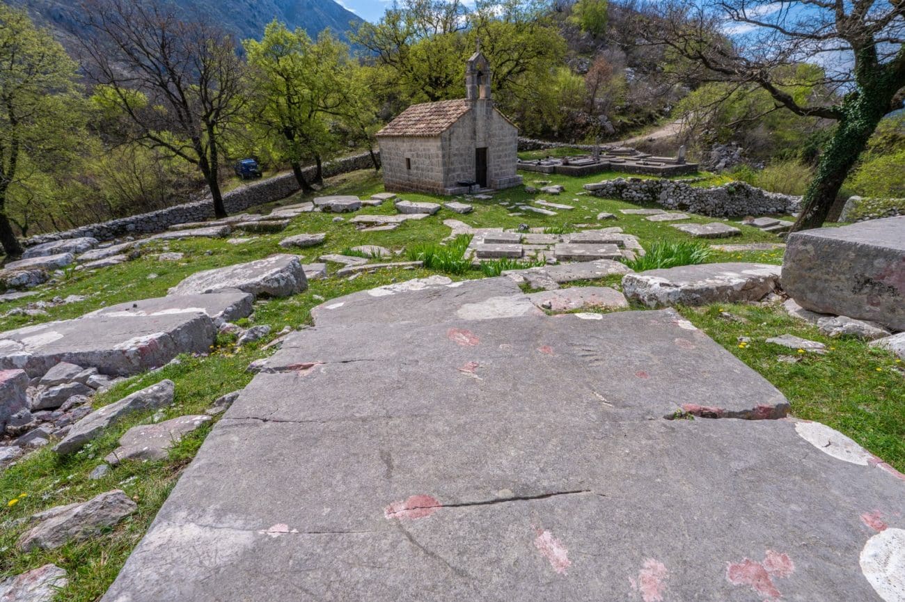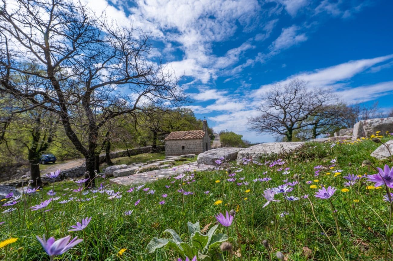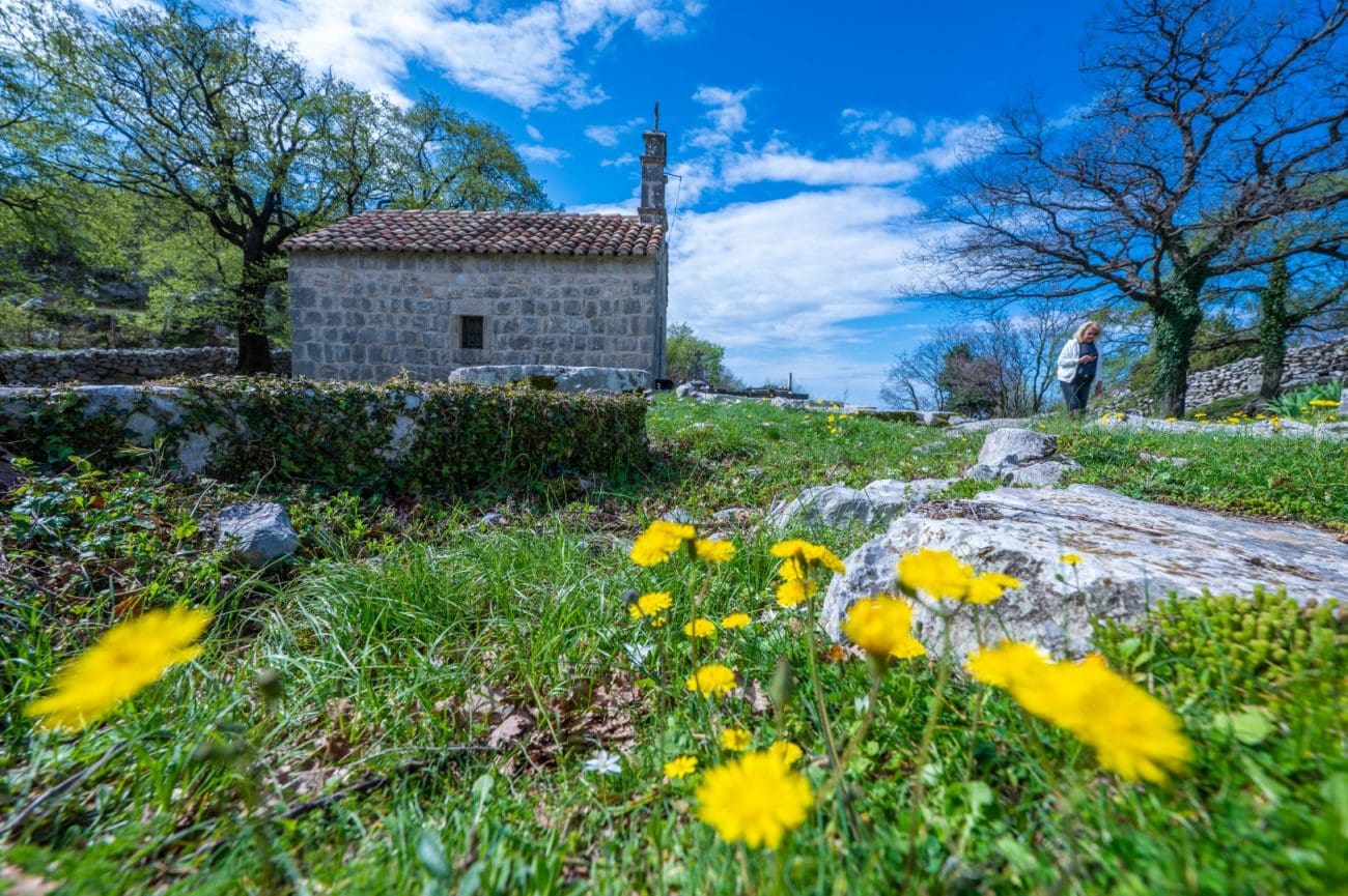Skromna romanička crkvica podignuta je na mjestu rimskog i ilirskog svetišta. „Ovdje vam se povijest, krajolik i identitet spajaju u jedan kamen“, najavljuje vodič dok se rijeke turista slijevaju iz autobusa. Gosti ga prate stazom posutom borovom iglicom: u blagom usjeku brežuljka otkrivaju se „kamene njive“ – pravilni nizovi ploča i sljemenjaka iz 14. i 15. stoljeća. Neki nose križeve, drugi lovačke prizore, treći plesne motive.