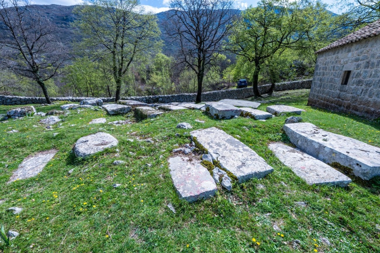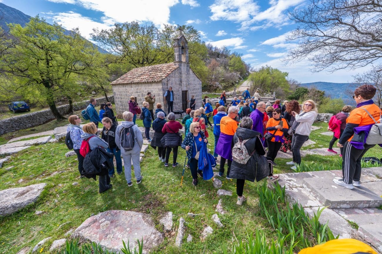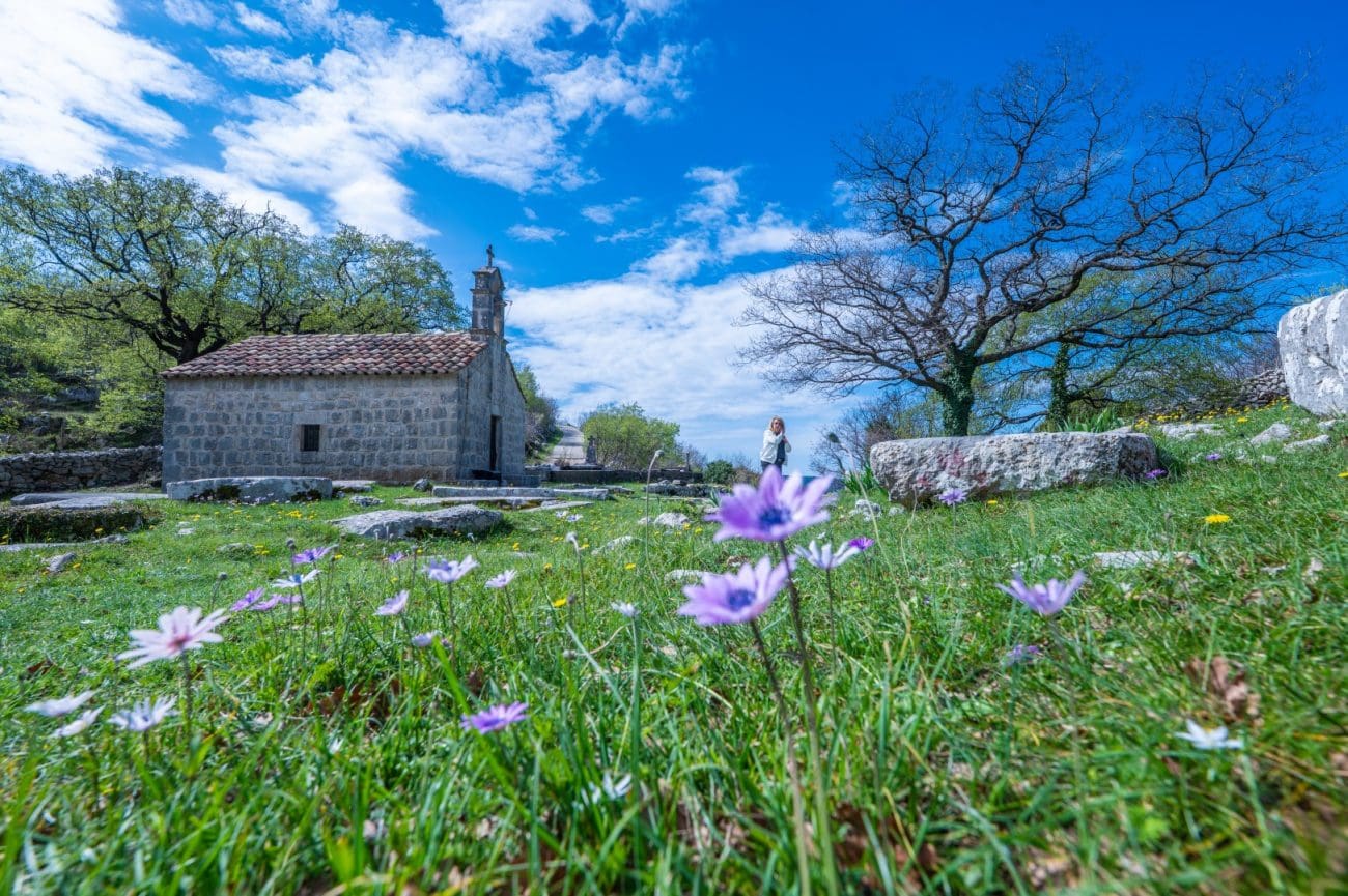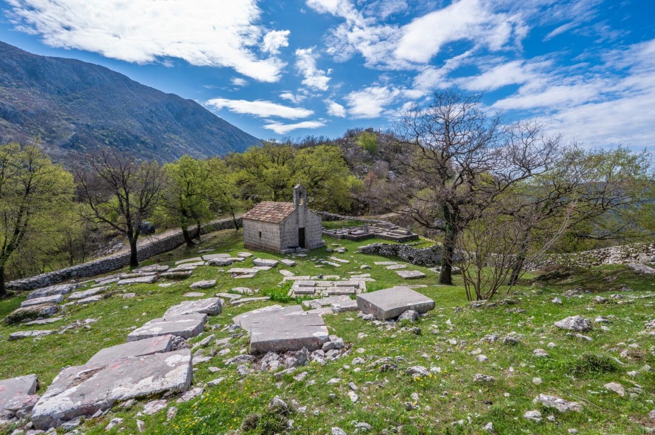 Skromna romanička crkvica podignuta je na mjestu rimskog i ilirskog svetišta. „Ovdje vam se povijest, krajolik i identitet spajaju u jedan kamen“, najavljuje vodič dok se rijeke turista slijevaju iz autobusa. Gosti ga prate stazom posutom borovom iglicom: u blagom usjeku brežuljka otkrivaju se „kamene njive“ – pravilni nizovi ploča i sljemenjaka iz 14. i 15. stoljeća. Neki nose križeve, drugi lovačke prizore, treći plesne motive.