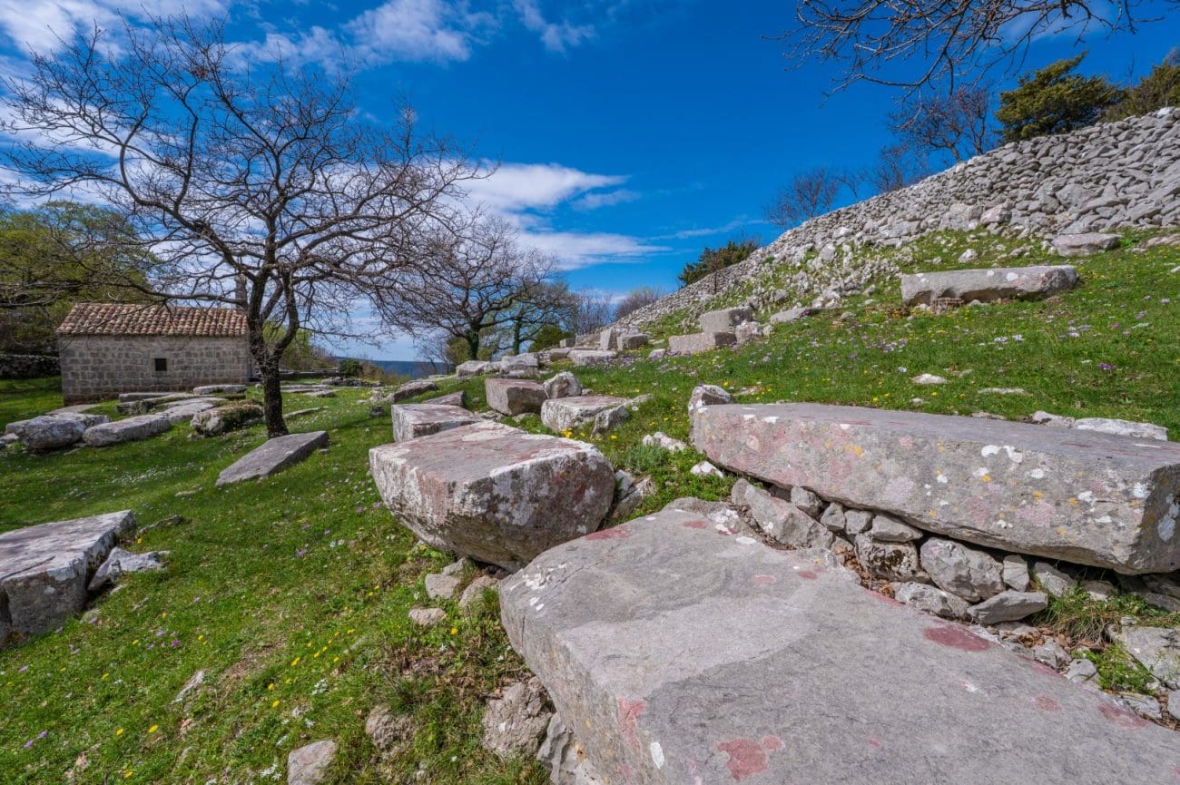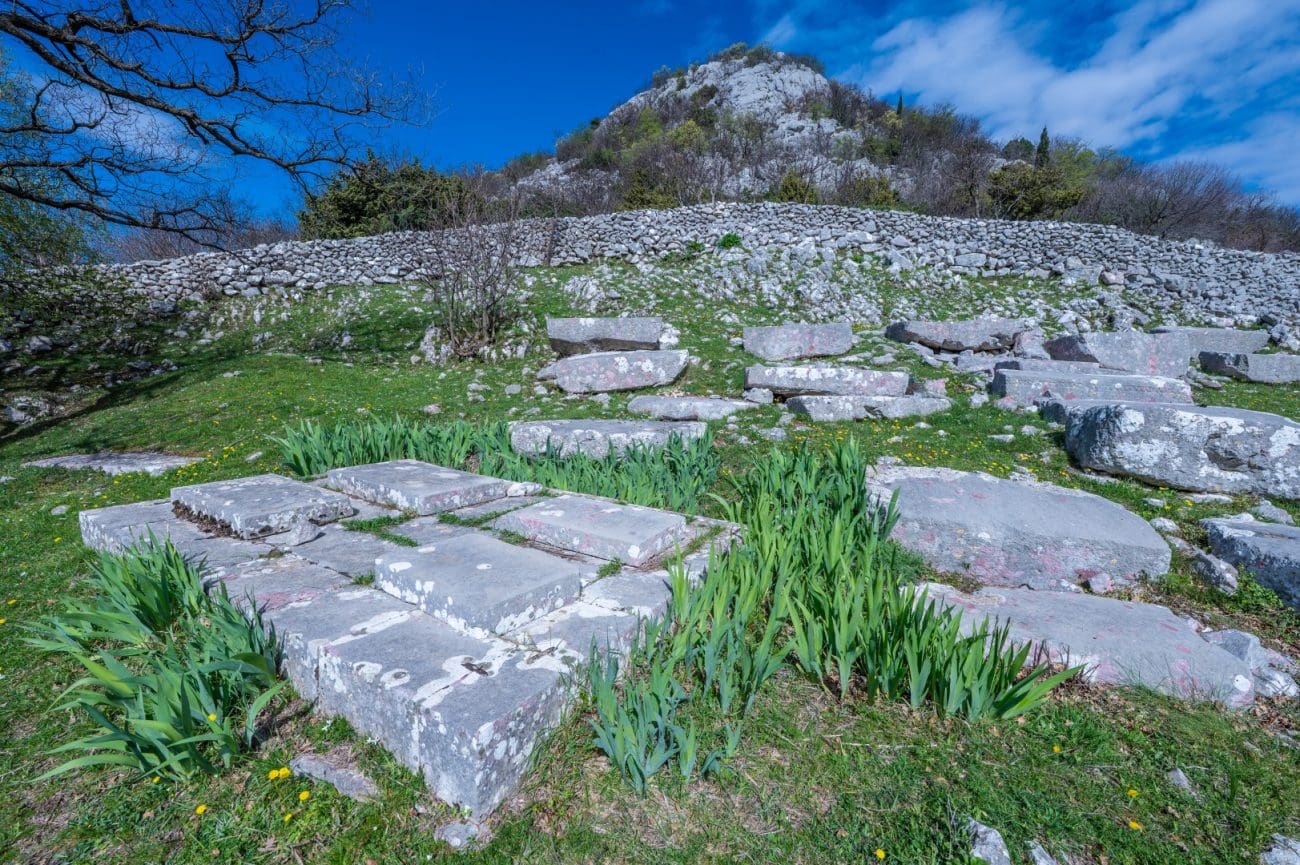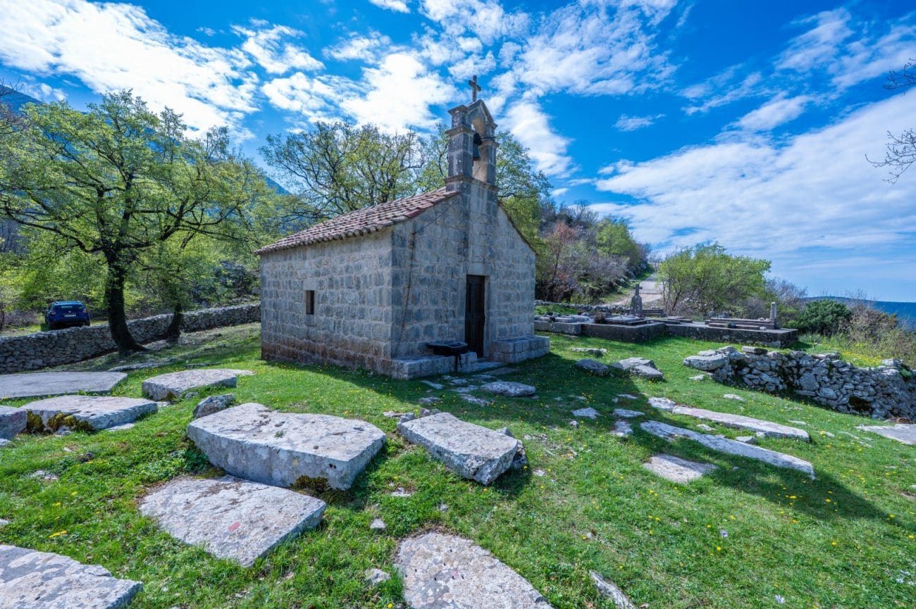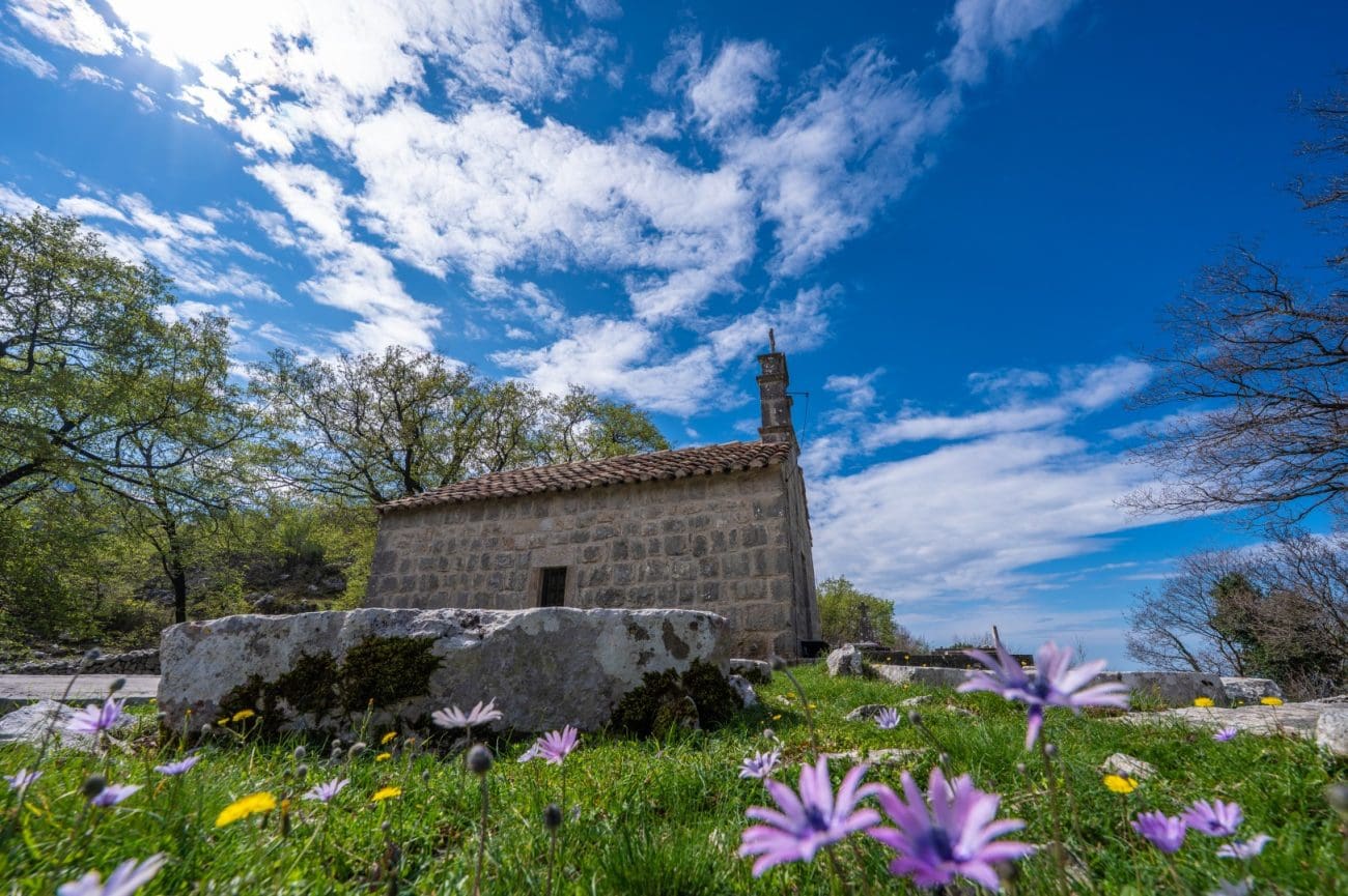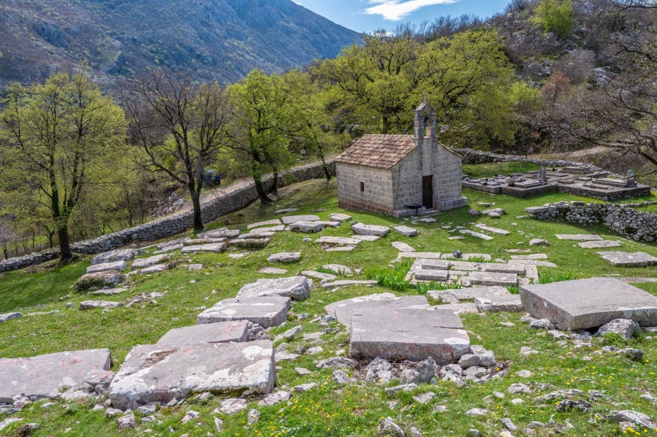 Skromna romanička crkvica podignuta je na mjestu rimskog i ilirskog svetišta. „Ovdje vam se povijest, krajolik i identitet spajaju u jedan kamen“, najavljuje vodič dok se rijeke turista slijevaju iz autobusa. Gosti ga prate stazom posutom borovom iglicom: u blagom usjeku brežuljka otkrivaju se „kamene njive“ – pravilni nizovi ploča i sljemenjaka iz 14. i 15. stoljeća. Neki nose križeve, drugi lovačke prizore, treći plesne motive.