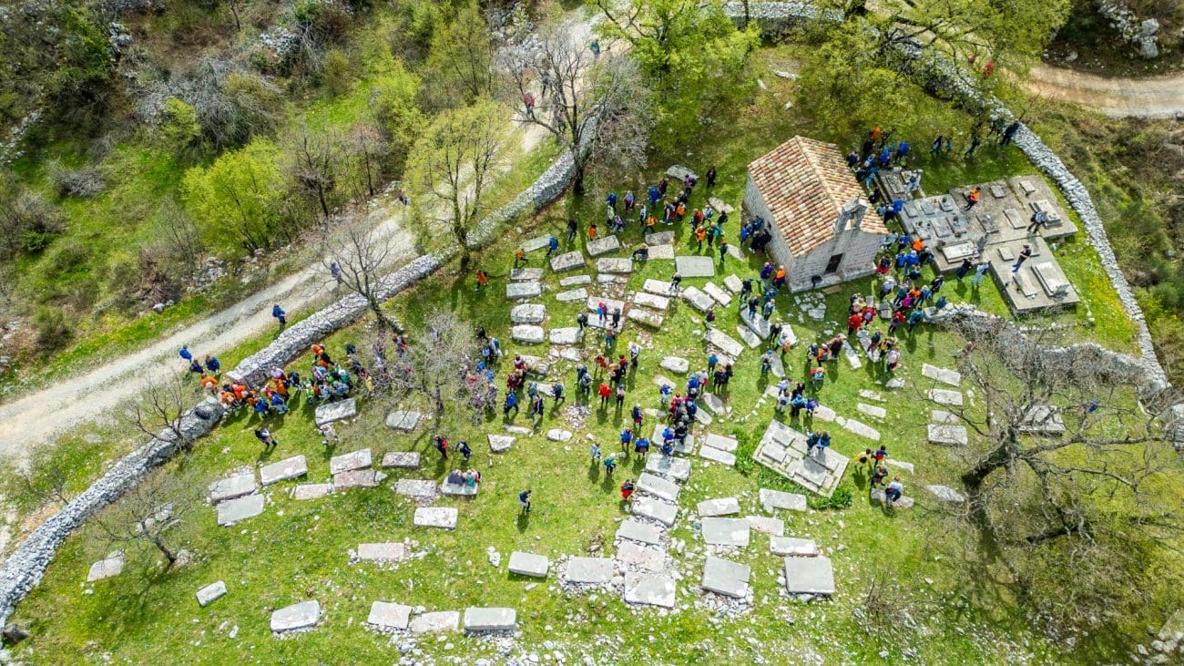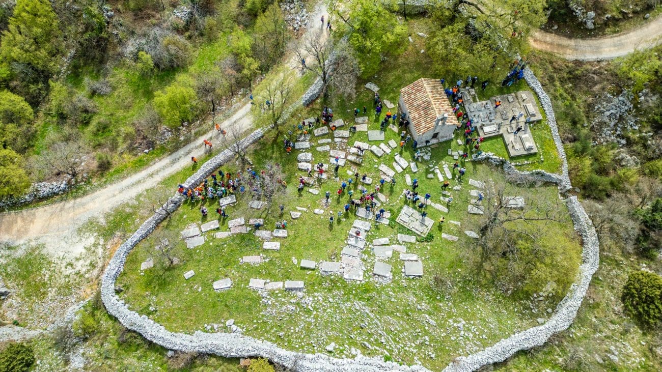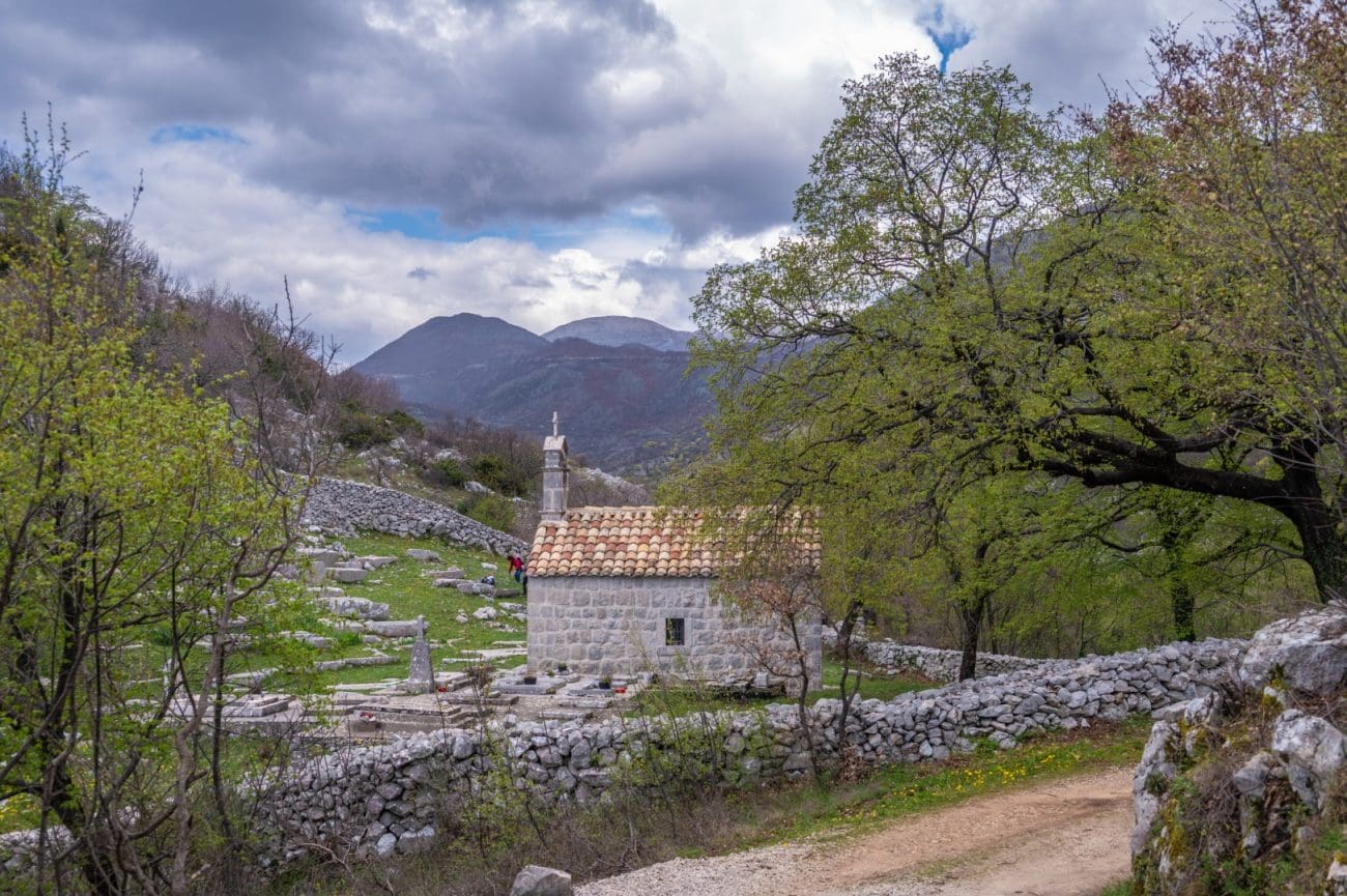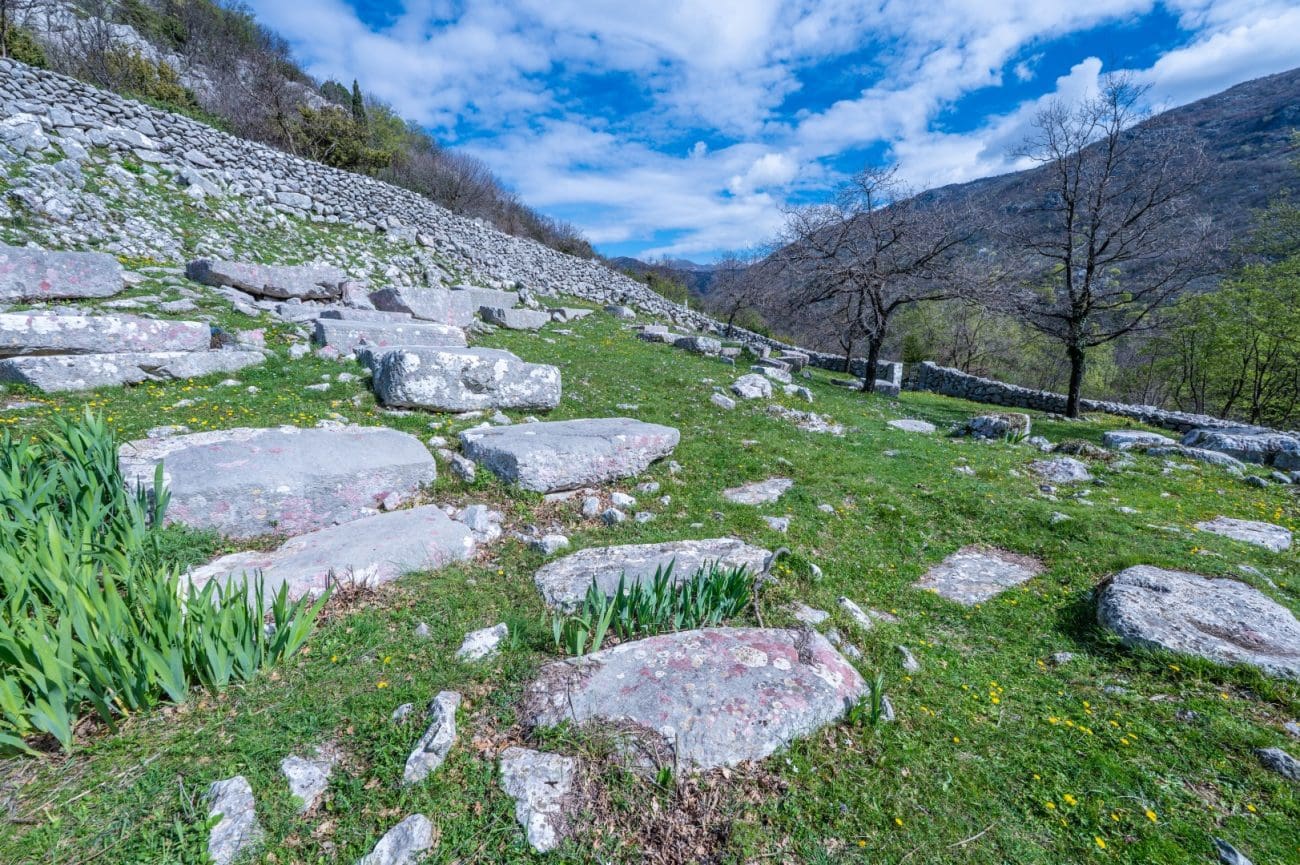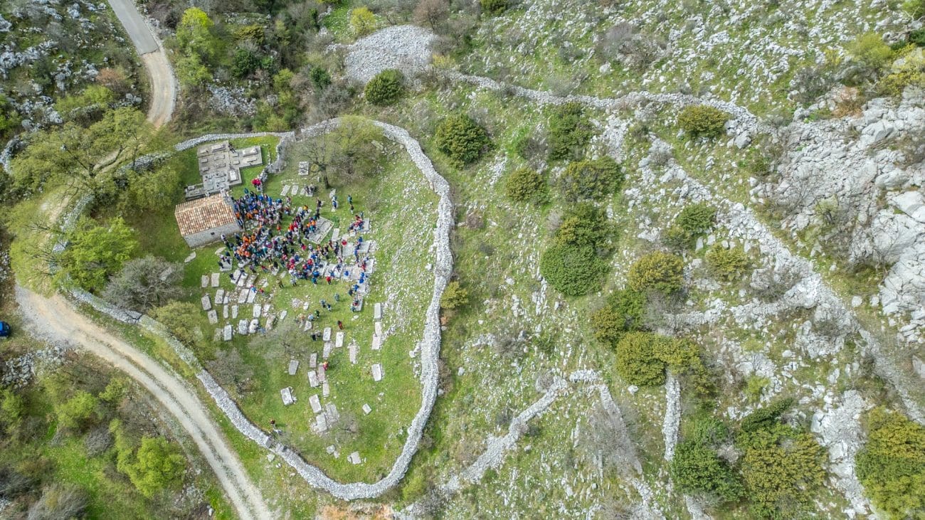 Skromna romanička crkvica podignuta je na mjestu rimskog i ilirskog svetišta. „Ovdje vam se povijest, krajolik i identitet spajaju u jedan kamen“, najavljuje vodič dok se rijeke turista slijevaju iz autobusa. Gosti ga prate stazom posutom borovom iglicom: u blagom usjeku brežuljka otkrivaju se „kamene njive“ – pravilni nizovi ploča i sljemenjaka iz 14. i 15. stoljeća. Neki nose križeve, drugi lovačke prizore, treći plesne motive.